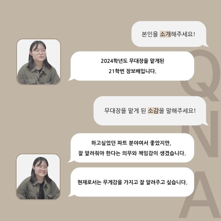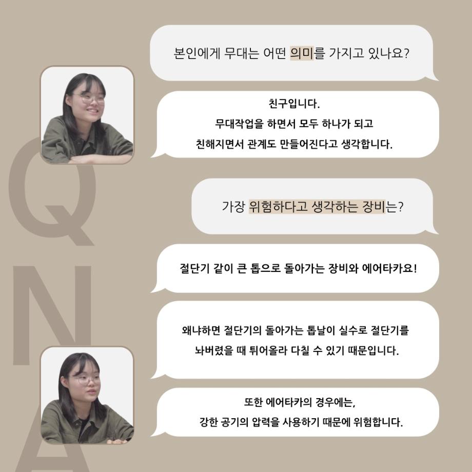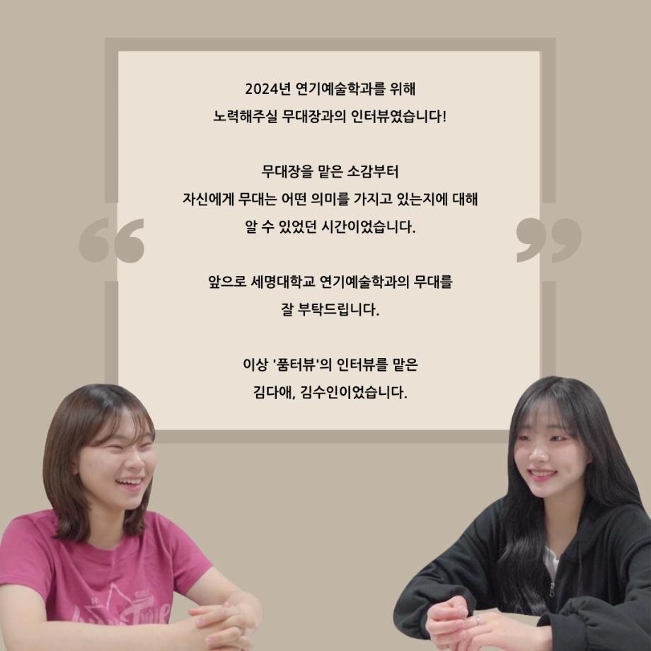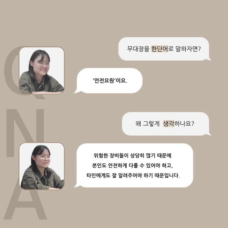 본문 시작 홈으로 커뮤니티 학과소개 입학정보 교수소개 학과과정 커뮤니티 공연예매 안내 홈페이지가이드 동아리 공지사항 포토갤러리 작품DB 동아리 학사일정 학생회 극장 스탭 동아리 무용 동아리 뮤지컬 동아리 극장 스탭 동아리 배우 훈련 동아리 극장 스탭 동아리 페이스북 트위터 프린트 ’품‘위있는 인’터뷰‘ - 24년도 무대장 <장보배> 연기예술학과 2504 2024-07-16 안녕하십니까. 24년도 학회 ‘품‘ 입니다. 학회 ‘품’의 네 번째 인터뷰로 세명대학교 연기예술학과 24학년도 무대장인 장보배 학우와 인터뷰 하는 시간을 가졌습니다. 무대장을 맡게된 소감과 무대는 어떤 의미가 있는지, 위험한 장비는 무엇이며 극장장과 학과생에게 전하고 싶은 말 등을 질문하는 시간을 가졌습니다. 앞으로 있을 인터뷰 컨텐츠인 ‘품터뷰’ 많은 사랑 부탁드립니다. 목록 이전’품‘위있는 인’터뷰‘ - 24년도 극장장 <이종화> 다음 ’품‘위있는 인’터뷰‘ - 24년도 조명장 <오승아> 만족도조사 만족도 조사 이 페이지에서 제공하는 정보에 대하여 만족하시나요? 매우만족 만족 보통 불만족 매우불만족