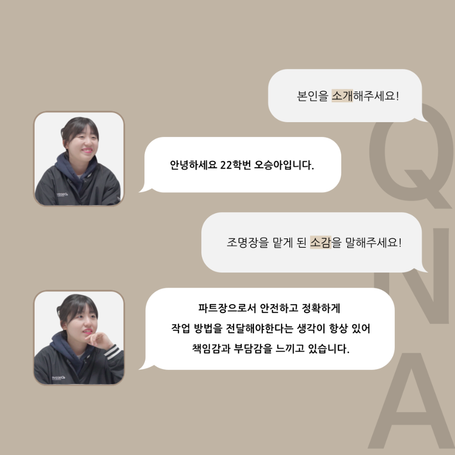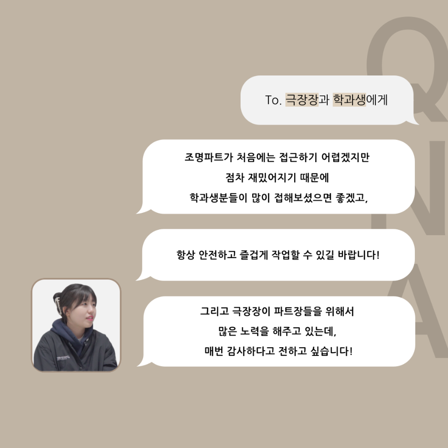 본문 시작 홈으로 커뮤니티 학과소개 입학정보 교수소개 학과과정 커뮤니티 공연예매 안내 홈페이지가이드 동아리 공지사항 포토갤러리 작품DB 동아리 학사일정 학생회 극장 스탭 동아리 무용 동아리 뮤지컬 동아리 극장 스탭 동아리 배우 훈련 동아리 극장 스탭 동아리 페이스북 트위터 프린트 ’품‘위있는 인’터뷰‘ - 24년도 조명장 <오승아> 연기예술학과 2430 2024-07-22 안녕하십니까. 24년도 학회 ‘품‘ 입니다. 학회 ‘품’의 다섯 번째 인터뷰로 세명대학교 연기예술학과 24학년도 조명장인 오승아 학우와 인터뷰 하는 시간을 가졌습니다. 조명장을 맡게된 소감과 조명은 어떤 의미가 있는지, 조명에서 조심히 해야하는 것은 무엇이며 극장장과 학과생에게 전하고 싶은 말 등을 질문하는 시간을 가졌습니다. 앞으로 있을 인터뷰 컨텐츠인 ‘품터뷰’ 많은 사랑 부탁드립니다. 목록 이전’품‘위있는 인’터뷰‘ - 24년도 무대장 <장보배> 다음 ’품‘위있는 인’터뷰‘ - 24년도 음향장 <임소정> 만족도조사 만족도 조사 이 페이지에서 제공하는 정보에 대하여 만족하시나요? 매우만족 만족 보통 불만족 매우불만족