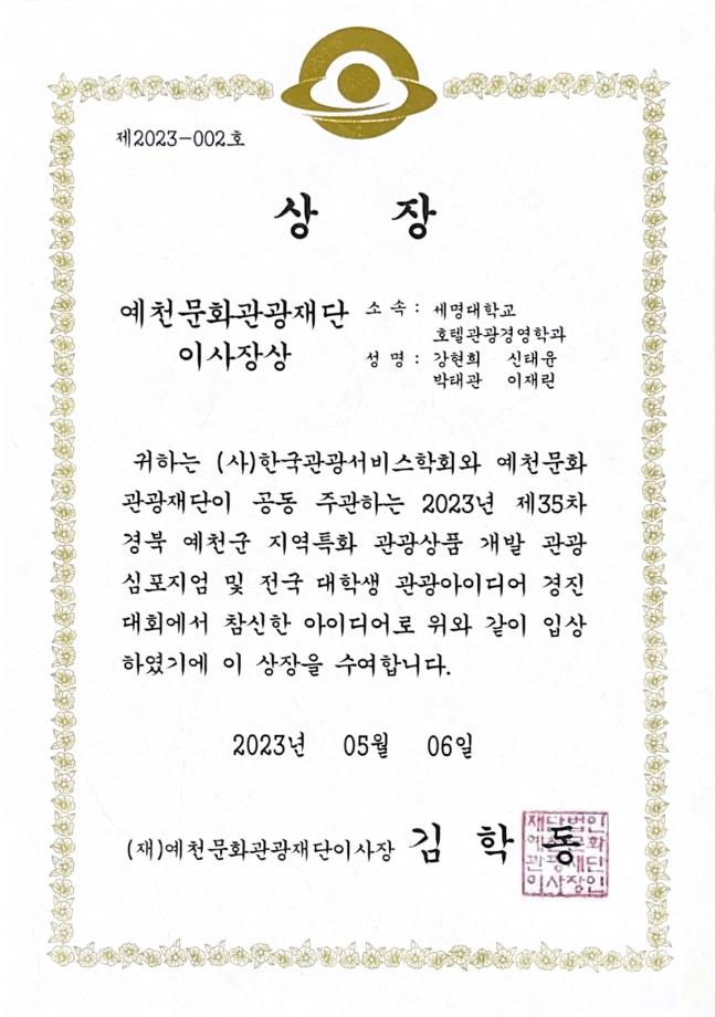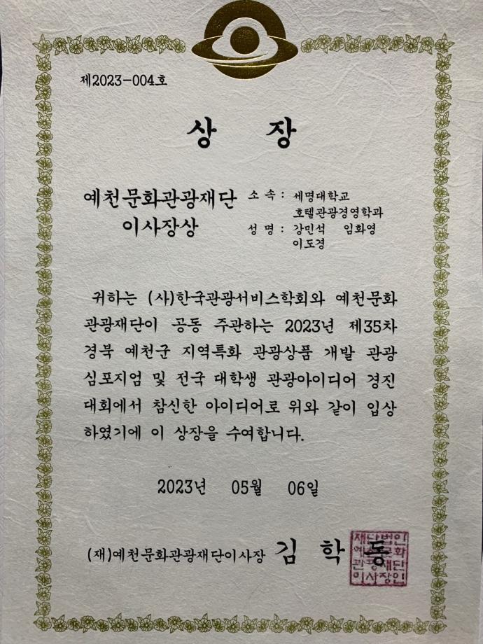 본문 시작 홈으로 커뮤니티 커뮤니티 학과소개 교육 홈페이지가이드 학과동아리 공지사항 학생회활동 학과동아리 취업정보 Idea Bank Idea Bank SOW 빵실빵실 쉐이커스 Idea Bank 페이스북 트위터 프린트 2023년 1학기 공모전 수상 호텔경영학과 2468 2023-05-15 2023년 1학기 공모전 수상 목록 이전2023년 1학기 동아리 활동사진 다음 2023년 2학기 동아리 활동 1 만족도조사 만족도 조사 이 페이지에서 제공하는 정보에 대하여 만족하시나요? 매우만족 만족 보통 불만족 매우불만족