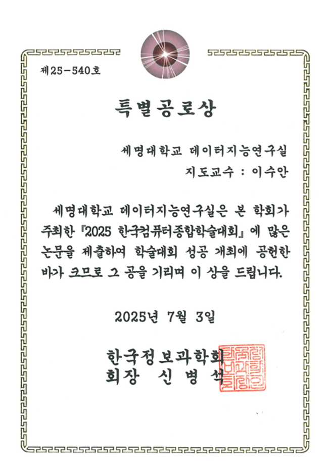 본문 시작 홈으로 학부활동 학부소개 학부활동 교육과정 커뮤니티 학부생활 입학안내 홈페이지가이드 전공 동아리 학부행사 학생회 활동 전공 동아리 학부갤러리 DI Lab DI Lab ICES Lab (Inteligent Computing Embedded System) DI Lab 페이스북 트위터 프린트 KCC2025 세명대학교 데이터지능연구실 (이수안 교수) 특별공로상 수상 컴퓨터학부 336 2025-09-05 2025 한국컴퓨터종합학술대회(KCC2025)에서 세명대학교 데이터지능연구실(이수안 교수)이 특별공로상을 수상하였습니다. 축하드립니다. 목록 이전컴퓨터학부 최윤성 학생 공정위, 프랜차이즈 데이터 활용 공모전 우수상 수상 다음 세명대학교 컴퓨터학부 데이터지능연구실, AI 진로 상담 연구로 2025 한국컴퓨터종합학술대회 우수상 수상 만족도조사 만족도 조사 이 페이지에서 제공하는 정보에 대하여 만족하시나요? 매우만족 만족 보통 불만족 매우불만족