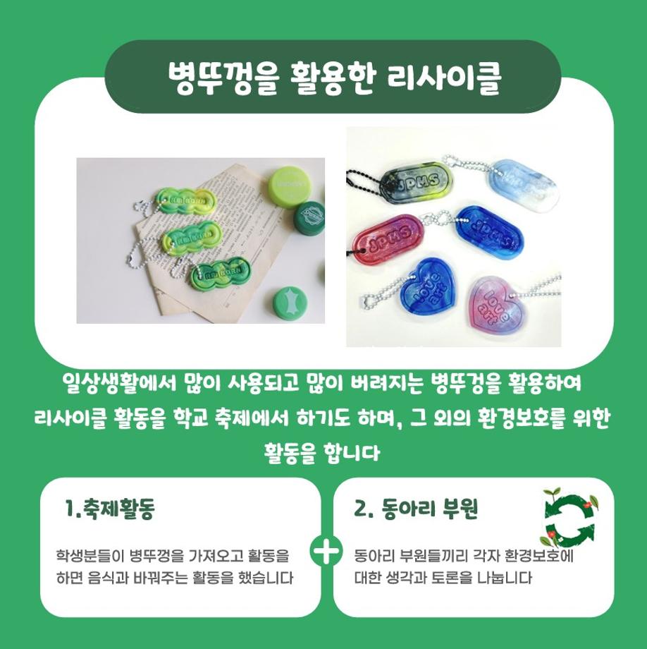 학교 축제에서는 학생들이 병뚜껑을 가져오면 음식을 나누어 주었고, 동아리 부원들과는 환경보호에 대한 다양한 생각을 나누며 뜻깊은 시간을 가졌습니다.