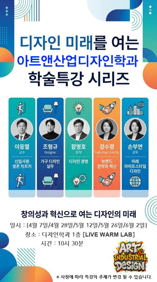 본문 시작 홈으로 학과생활 학과소개 교수소개 교과과정 학과생활 홈페이지가이드 학과행사 공지사항 사진게시판 전공자료실 동아리 학과행사 학과행사 페이스북 트위터 프린트 [학술특강] 2026학년도 1학기 학술특강 계획 아트앤산업디자인학과 63 2026-04-22 목록 이전[특강] 산업디자인 실무체험 학술특강 [가구디자인실무 &취업가이드] 만족도조사 만족도 조사 이 페이지에서 제공하는 정보에 대하여 만족하시나요? 매우만족 만족 보통 불만족 매우불만족