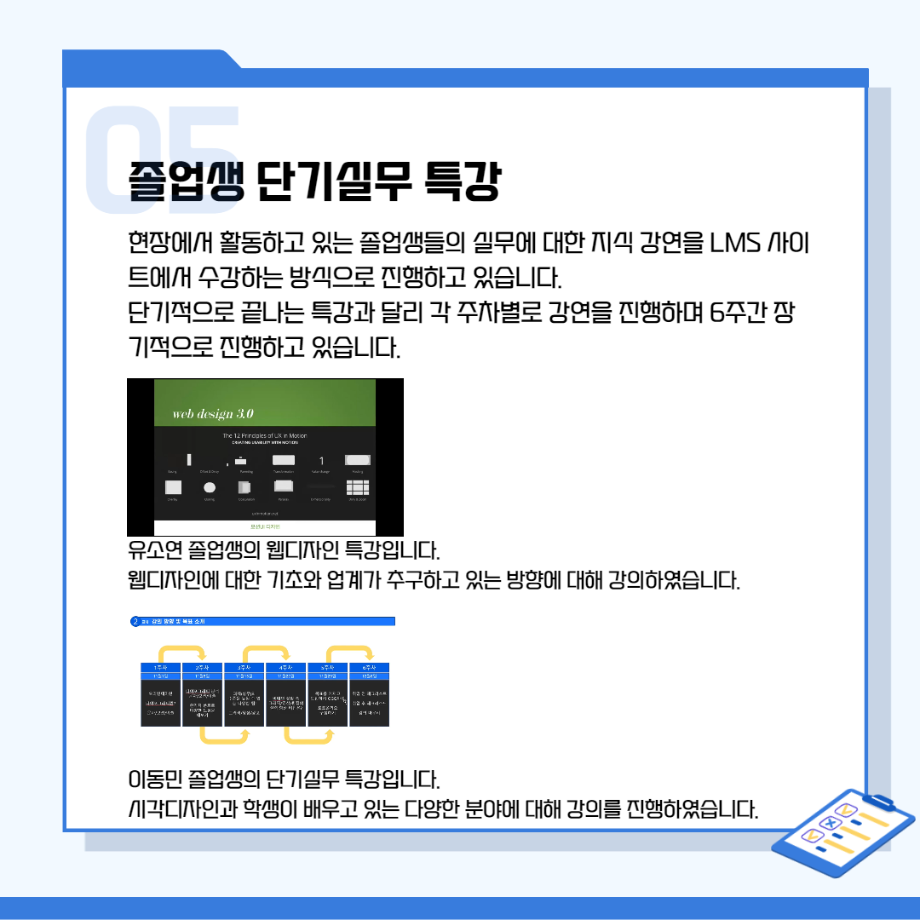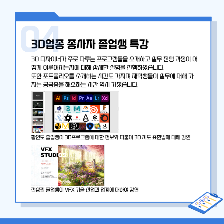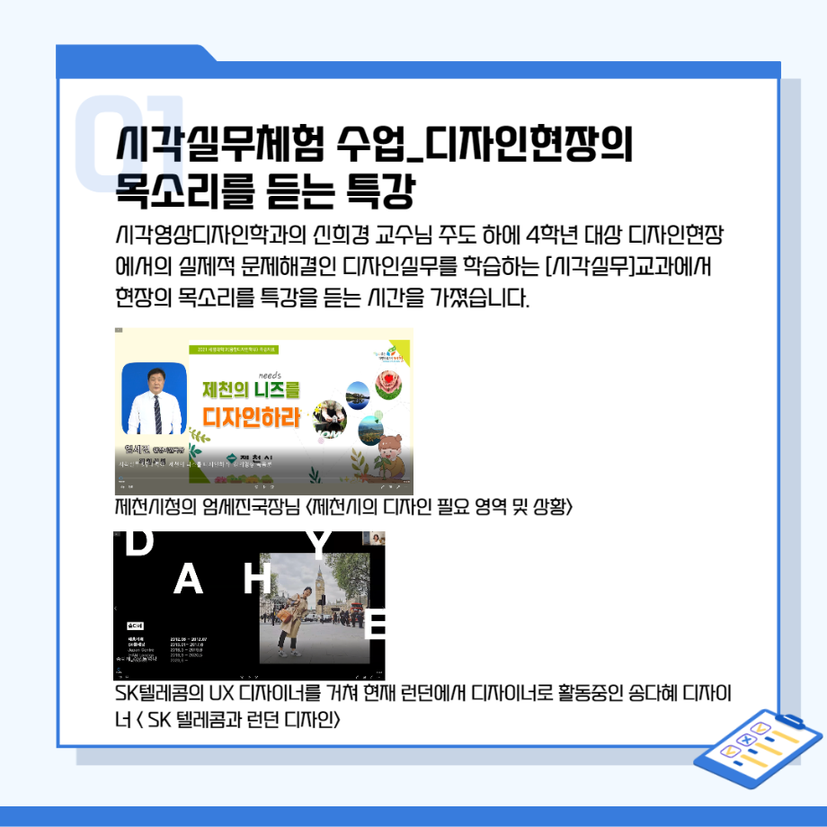 본문 시작 홈으로 시영소식 학과소개 학과과정 시영소식 입학/취업 AI 학과자랑 SNS소통 홈페이지가이드 학과행사 공지사항 학과행사 공모전 학생 인터뷰 학과행사 페이스북 트위터 프린트 시각영상디자인학과 특강 총정리! 시각영상디자인학과 2649 2022-02-07 목록 이전[대학혁신지원사업]단기실무 프로그램 다음 인문예술대학 특강 - 변화와 혁신의 시대! 열정과 디테일로 승부하라!!! 담당부서 : 시각영상디자인학과 담당자 : - 연락처 : 043-649-1726 최종수정일 : 2024-10-26 만족도조사 만족도 조사 이 페이지에서 제공하는 정보에 대하여 만족하시나요? 매우만족 만족 보통 불만족 매우불만족