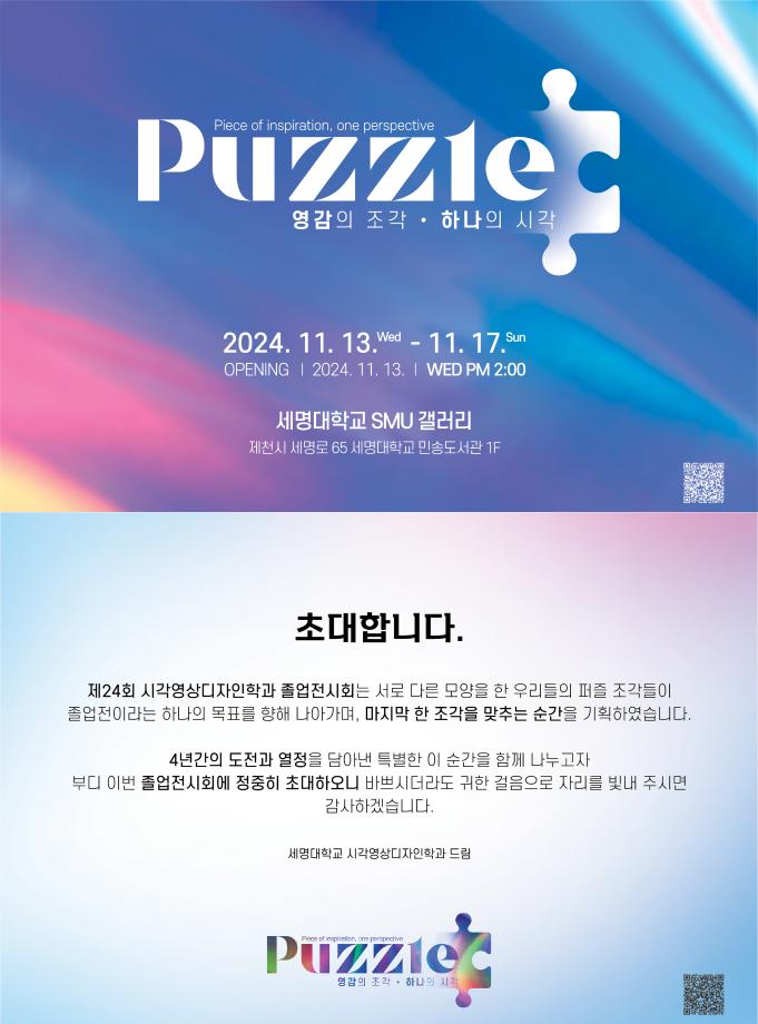 본문 시작 홈으로 시영소식 학과소개 학과과정 시영소식 입학/취업 AI 학과자랑 SNS소통 홈페이지가이드 학과행사 공지사항 학과행사 공모전 학생 인터뷰 학과행사 페이스북 트위터 프린트 2024 졸업전시회 오프닝 시각영상디자인학과 1981 2024-11-07 본교 캠퍼스에서 총장님을 모시고 11월 13일 오후2시에 본교 캠퍼스 smu갤러리에서 오프닝행사를 성대히 치렀습니다, 4학년 모두의 노고에 감사하고 다시 한번 졸전을 축하합니다 모바일 초대장 https://dodoring12.github.io/ 목록 이전2024 세명 콘텐츠 스쿨 콘텐츠 피칭 다음 햄버거데이 담당부서 : 시각영상디자인학과 담당자 : - 연락처 : 043-649-1726 최종수정일 : 2024-10-26 만족도조사 만족도 조사 이 페이지에서 제공하는 정보에 대하여 만족하시나요? 매우만족 만족 보통 불만족 매우불만족