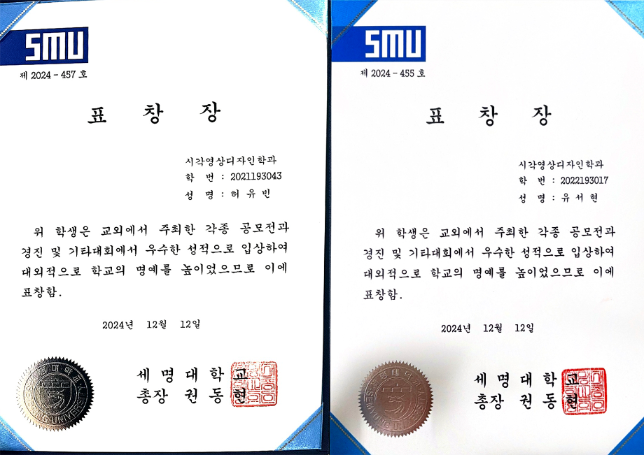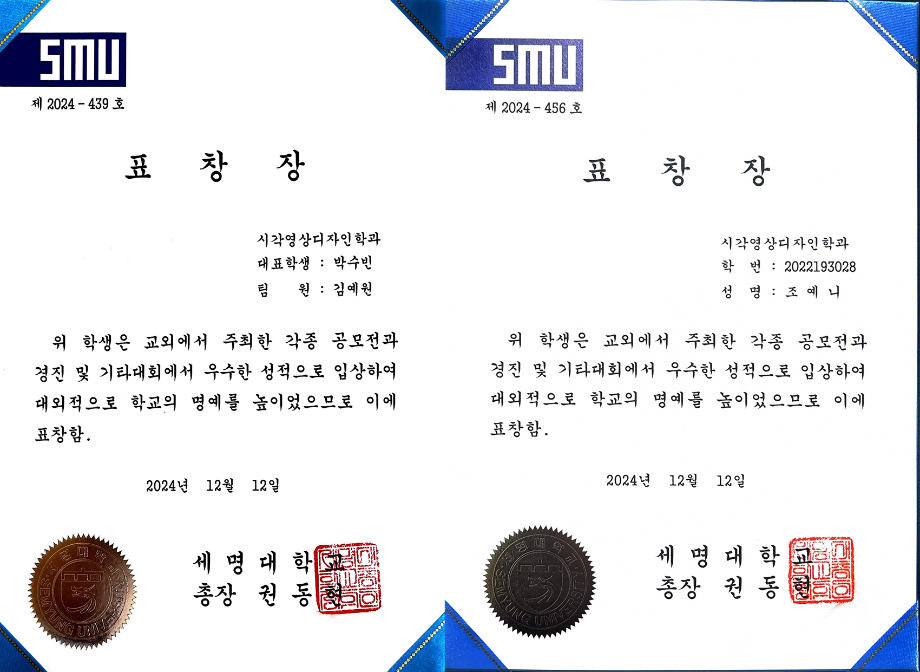 본문 시작 홈으로 시영소식 학과소개 학과과정 시영소식 입학/취업 AI 학과자랑 SNS소통 홈페이지가이드 학과행사 공지사항 학과행사 공모전 학생 인터뷰 학과행사 페이스북 트위터 프린트 2024학년도 2학기 총장표창 수여식 시각영상디자인학과 1849 2024-12-20 우리학과에서 5명이 대외수상 분야로 수상하였습니다 축하합니다~ 4학년 - 김예원, 허유빈, 박수빈 3학년 - 조예니, 유서현 목록 이전세명고 전공체험(12.18.수) 다음 AI 콘텐츠연구소 전시 안내 담당부서 : 시각영상디자인학과 담당자 : - 연락처 : 043-649-1726 최종수정일 : 2024-10-26 만족도조사 만족도 조사 이 페이지에서 제공하는 정보에 대하여 만족하시나요? 매우만족 만족 보통 불만족 매우불만족