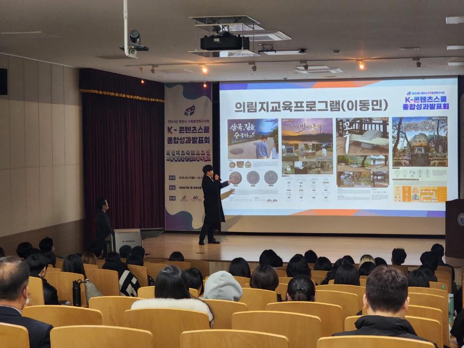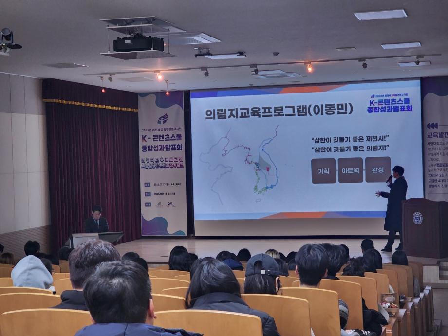 K-콘텐츠스쿨 <의림지 교육 프로그램>은 전문 디자이너를 초청하여 학생들의 교육 기획 및 그래픽 실무 능력을 향상시킴과 동시에 제천 10경 중 제1경인 의림지 관광 활성화를 위한 관련 설화 등을 기반으로 팀 단위 프로젝트를 통해 재미있는 아이디어를 도출하고, 그 마중물을 제작하고 전시하는 성과를 거두었습니다.