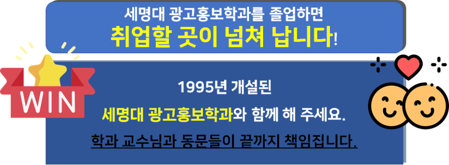 본문 시작 홈으로 매력적인 학과소개 매력적인 학과소개 흥미로운 교육과정 특별CC프로그램 We can 취업 따뜻한 커뮤니티 홈페이지가이드 지금 우리 광홍은 학과개요 학과연혁 교수소개 Wilco로 보는광고홍보학과 지금 우리 광홍은 지금 우리 광홍은 페이스북 트위터 프린트 [취업현황]우리 광홍 취업은 광고홍보학과 3543 2024-09-13 우리 광홍은 취업률이 좋습니다. 최근 취업률이 70% 이상을 기록하고 있습니다. * 1995년 개설된 '역사'와 '전통', '역량'을 가진 우리 광홍 여러분의 취업과 성공을 학과는 기도하고 돕겠습니다. "기획맛집" 세명대 광고홍보학과!! 기획력이 경쟁력이다~. 목록 이전[수상]2024코삭챌린저상 다음 [경축]2025대한민국 대학생 광고대회 '최우수상'수상_대전충청지역대회