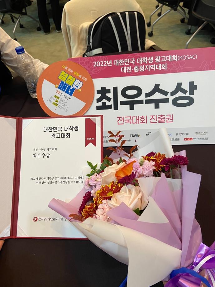 문화체육관광부 주최 <2022년 대한민국 대학생 광고 경진대회> 대전/충청권에서 1위(최우수상)를 차지했습니다.