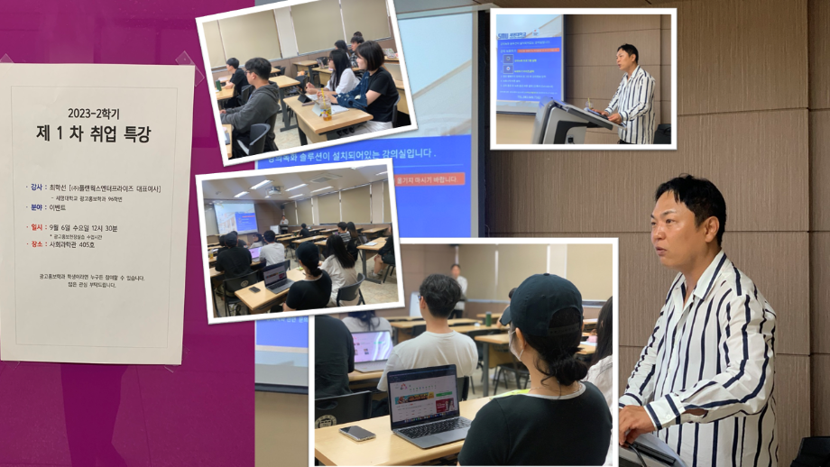 본문 시작 홈으로 매력적인 학과소개 매력적인 학과소개 흥미로운 교육과정 특별CC프로그램 We can 취업 따뜻한 커뮤니티 홈페이지가이드 지금 우리 광홍은 학과개요 학과연혁 교수소개 Wilco로 보는광고홍보학과 지금 우리 광홍은 지금 우리 광홍은 페이스북 트위터 프린트 [취업특강1탄] 광고홍보학과 5651 2023-09-11 23학년도 2학기 취업특강 제1탄 BTL 전문회사 '플랜웍스엔터프라이즈' _일시 : 2023년 9월 6일(수), 12:30~ _장소 : 사회과학관 405호 _내용 : BTL, 이벤트, 프로모션 산업계 현황 및 취업 노하우 _강사 : 플랜웍스엔터프라이즈 최학선(대표이사) * 특강 후 1:1 취업 면담도 진행했습니다. 이벤트 분야 취업을 희망하는 학생은 추후라도 연락주시면 취업을 돕겠습니다. : ) 목록 이전[국제광고대회참가] 다음 [취업특강2탄]