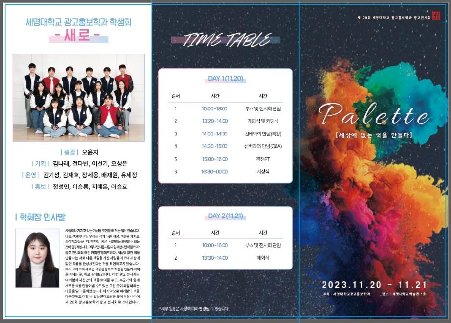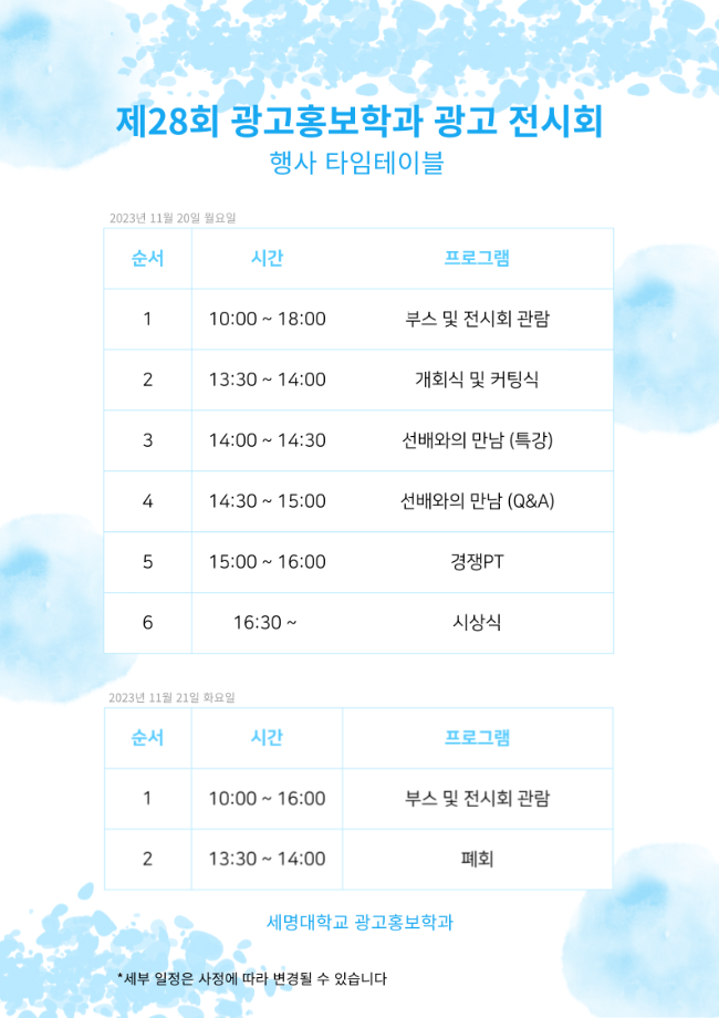 본문 시작 홈으로 매력적인 학과소개 매력적인 학과소개 흥미로운 교육과정 특별CC프로그램 We can 취업 따뜻한 커뮤니티 홈페이지가이드 지금 우리 광홍은 학과개요 학과연혁 교수소개 Wilco로 보는광고홍보학과 지금 우리 광홍은 지금 우리 광홍은 페이스북 트위터 프린트 [전시회]제28회 광고전시회 개최 광고홍보학과 3347 2023-11-15 28년째를 맞이하는 광고홍보학과의 시그니처 프로그램 '광고전시회'가 개최됩니다. _일시 : 2023년 11월 20일 ~ 21일, 2일간 _장소 : 세명대학교 학술관 1층 일대 _주제 : 팔레트 : 세상에 없는 색을 만들다 _프로그램 : 경쟁PT, 공모전 작품, 산학협력 프로그램 작품, 이벤트, 포토존 등 많은 참여 바랍니다. 목록 이전[애드아시아]국제광고행사참가 다음 [학과홍보]지금 우리 광홍은!