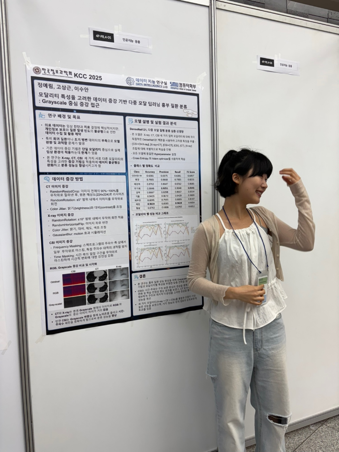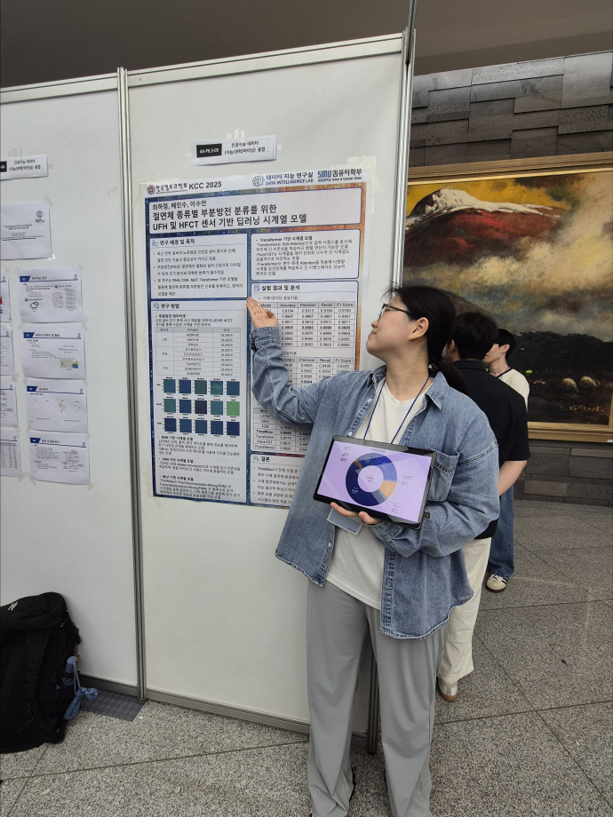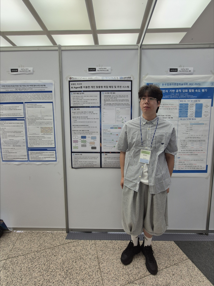 본문 시작 홈으로 학부활동 학부소개 학부활동 교육과정 커뮤니티 학부생활 입학안내 홈페이지가이드 학부행사 학부행사 학생회 활동 전공 동아리 학부갤러리 학부행사 페이스북 트위터 프린트 2025 한국컴퓨터종합학술대회 논문 발표 참가 - 2 컴퓨터학부 739 2025-07-09 국내 컴퓨터분야 최대 학술대회인 2025 한국컴퓨터종합학술대회 논문 발표에 참여한 이수현, 이하은, 장영진, 정예림, 진동민, 최하정 학생입니다. 모두 고생하셨습니다! 목록 이전2025 한국컴퓨터종합학술대회 논문 발표 참가 - 1 다음 - KCC2025 세명대학교 데이터지능연구실 (이수안 교수) 특별공로상 수상 만족도조사 만족도 조사 이 페이지에서 제공하는 정보에 대하여 만족하시나요? 매우만족 만족 보통 불만족 매우불만족