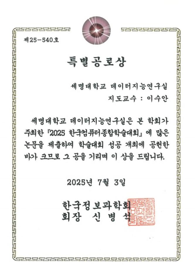본문 시작 홈으로 학부활동 학부소개 학부활동 교육과정 커뮤니티 학부생활 입학안내 홈페이지가이드 학부행사 학부행사 학생회 활동 전공 동아리 학부갤러리 학부행사 페이스북 트위터 프린트 - KCC2025 세명대학교 데이터지능연구실 (이수안 교수) 특별공로상 수상 컴퓨터학부 785 2025-07-18 2025 한국컴퓨터종합학술대회(KCC2025)에서 세명대학교 데이터지능연구실(이수안 교수)이 특별공로상을 수상하였습니다. 축하드립니다. 목록 이전2025 한국컴퓨터종합학술대회 논문 발표 참가 - 2 다음 컴퓨터학부 최윤성 학생 공정위, 프랜차이즈 데이터 활용 공모전 우수상 수상 만족도조사 만족도 조사 이 페이지에서 제공하는 정보에 대하여 만족하시나요? 매우만족 만족 보통 불만족 매우불만족