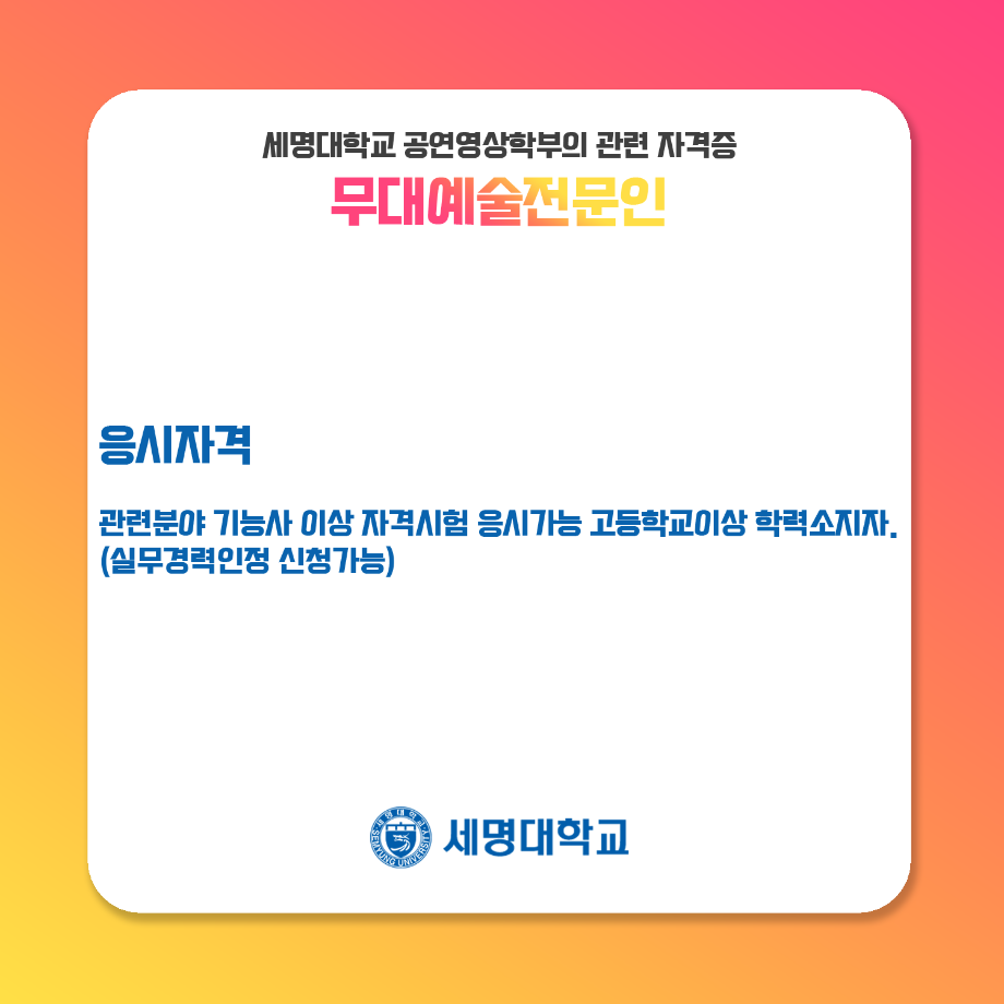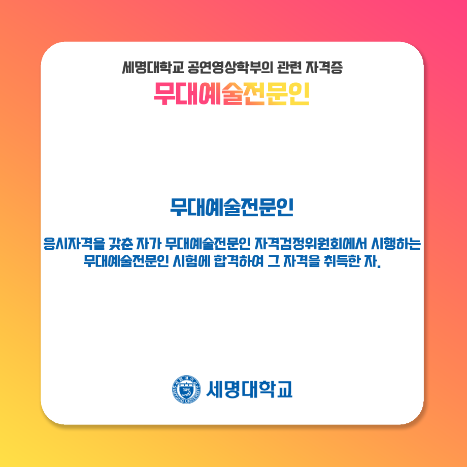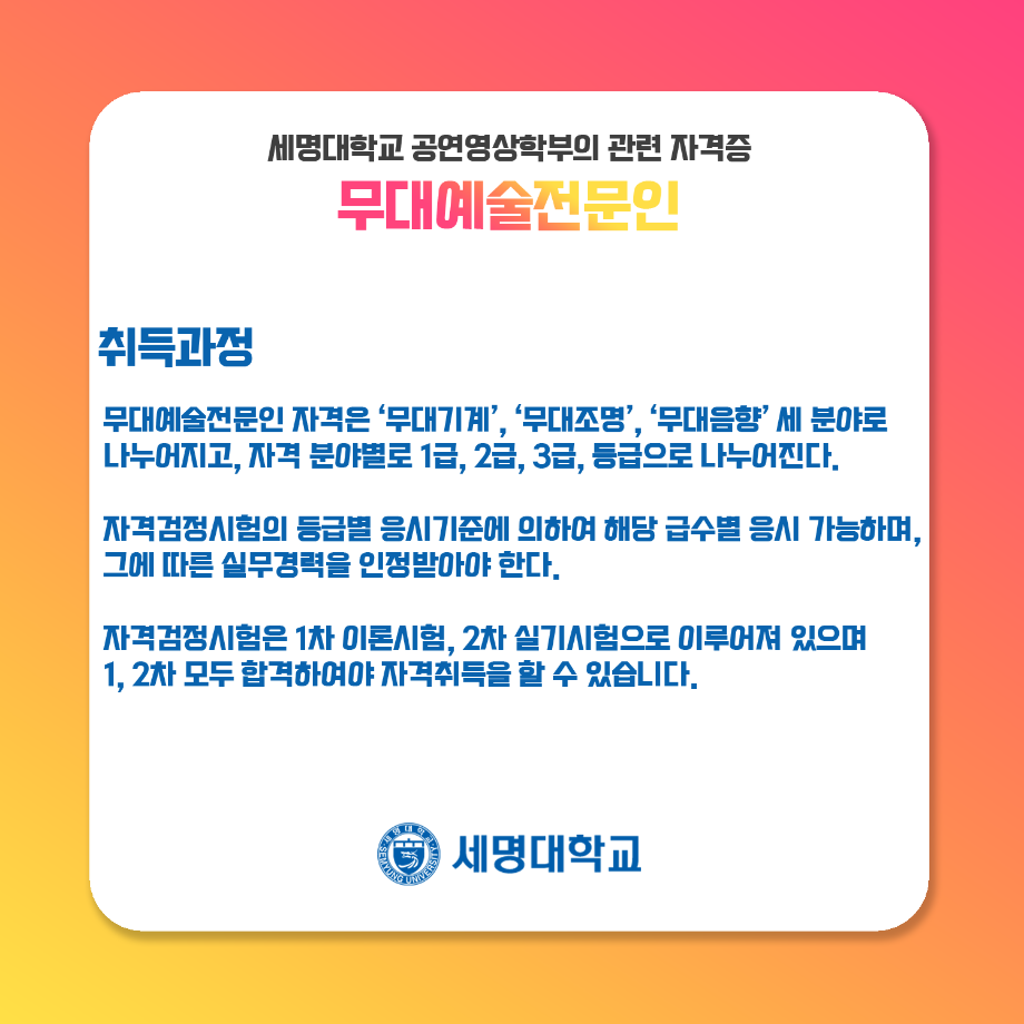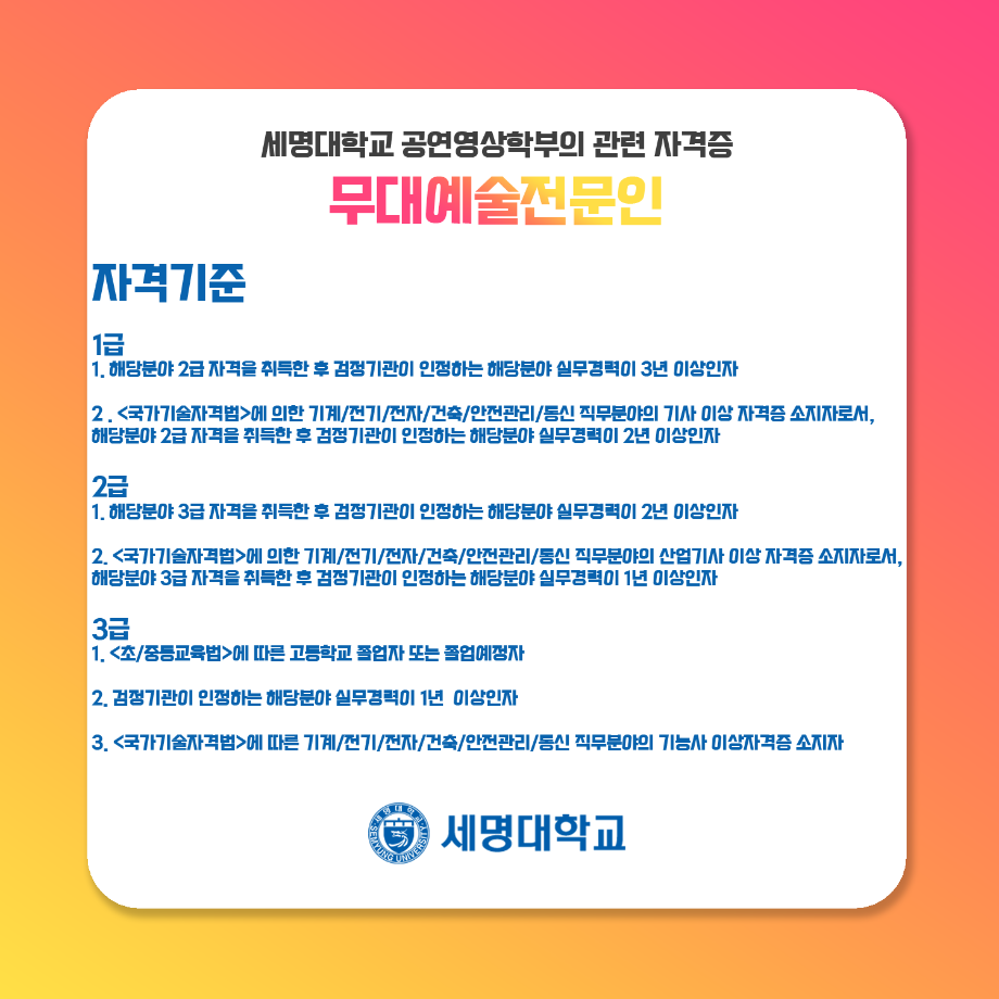 본문 시작 홈으로 학과과정 학과소개 입학정보 교수소개 학과과정 커뮤니티 공연예매 안내 홈페이지가이드 비교과프로그램 교육과정 전공교육 체계도 비교과프로그램 MOU 체결 연극놀이 지도사 양성 교육 하계, 동계 프로젝트 연극놀이 지도사 양성 교육 현장실습 프로그램 액팅플러스 연극놀이 지도사 양성 교육 페이스북 트위터 프린트 무대예술 전문인 자격증 연기예술학과 4280 2022-01-16 세명대학교 연기예술학과에서는 학과생을 위하여 매년 무대예술전문인 자격증 취득을 위한 교육을 지원하고 있습니다. ㅤㅤ 제 1전공뿐만이 아닌 학부와 관련된 다양한 전공을 경험하면서 스탭 분야별(무대, 조명, 음향)로 전공 지식을 함양함과 동시에 초대 강사님들의 지도하에 많은 학생들이 교육 과정을 이수하고 있습니다! 목록 이전연극놀이 지도사 자격증 이전연극놀이 지도사 양성 교육 1일차 활동 사진 만족도조사 만족도 조사 이 페이지에서 제공하는 정보에 대하여 만족하시나요? 매우만족 만족 보통 불만족 매우불만족