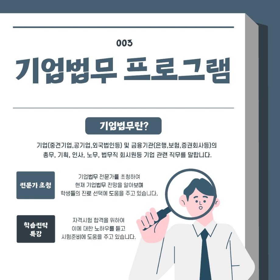 본문 시작 홈으로 학과과정 학과안내 교수소개 학과과정 커뮤니티 홈페이지가이드 비교과프로그램 교육과정 전공교육 체계도 대학원 법학과 비교과프로그램 학사일정 기업법무 지원프로그램 공공법무 지원프로그램 기업법무 지원프로그램 기업법무 지원프로그램 페이스북 트위터 프린트 비교과 프로그램 알아보기 '기업법무' 법학과 422 2025-09-04 목록 이전기업법무 지원프로그램이란??? 이전2025.05.21 항공운송법 관련 특강 담당부서 : 법학과 담당자 : - 연락처 : 043-649-1764 최종수정일 : 2024-10-26 만족도조사 만족도 조사 이 페이지에서 제공하는 정보에 대하여 만족하시나요? 매우만족 만족 보통 불만족 매우불만족