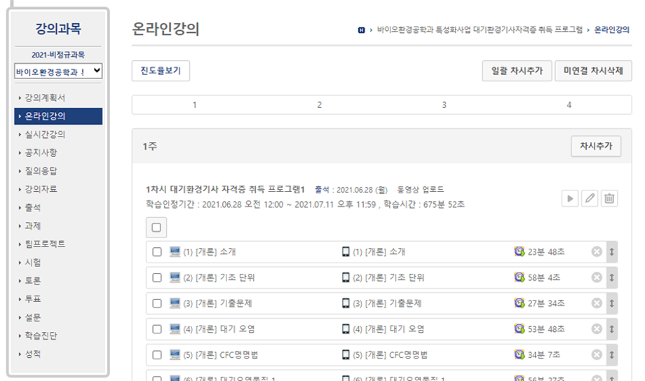 본문 시작 홈으로 학과과정 학과소개 교수소개 학과과정 커뮤니티 홈페이지가이드 비교과프로그램 교육과정 전공교육 체계도 졸업요건 비교과프로그램 특성화 환경기사자격증 취득 특성화 환경기사자격증 취득 환경기사자격증 멘토링 시스템 환경기사자격증 단기실무 학과 특성화 포인트 제도 대학혁신지원Creative Cube 특성화 환경기사자격증 취득 페이스북 트위터 프린트 2021학년도 특성화 환경기사 자격증 취득 프로그램 시행 바이오환경공학과 3591 2022-01-26 2021학년도 특성화 환경기사 자격증 취득 프로그램을 하계 방학동안 비대면으로 실시하였습니다. 본 프로그램을 통해 재학생들이 환경기사 자격증을 취득하며 진로 의사결정에 도움이 되었으면 좋겠습니다! 다음 학년도에도 많은 관심과 참여 해주시고 자격증 취득을 기원합니다! 목록 이전특성화 환경기사 자격증 프로그램 담당부서 : 환경에너지학과 담당자 : - 연락처 : 043-649-1337 최종수정일 : 2024-10-26 만족도조사 만족도 조사 이 페이지에서 제공하는 정보에 대하여 만족하시나요? 매우만족 만족 보통 불만족 매우불만족