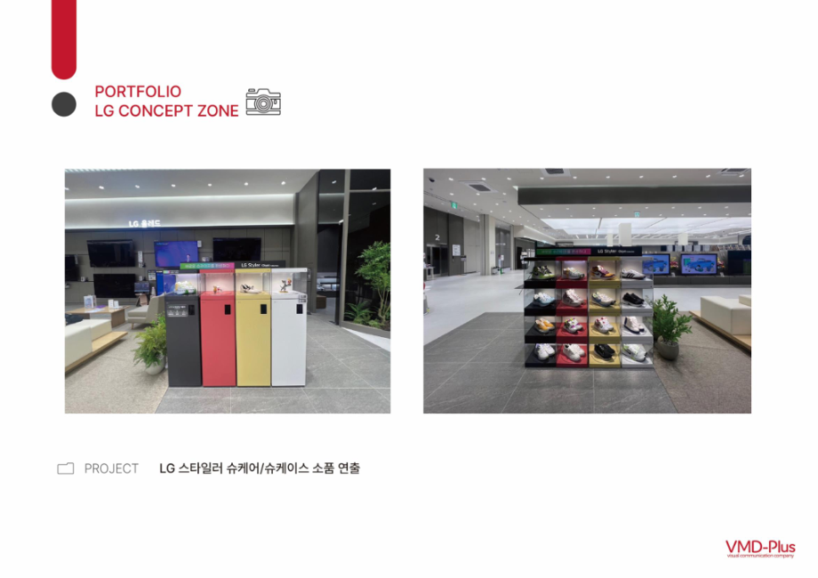 브이엠디플러스는 LG전자 가전매장 연출을 담당하였던 VMD(visual merchandiser) 조직 구성원을 주축으로 국내 유일의 전자 관련 VMD 회사로 매장 연출 기획과 현장 실행을 주도하는 회사힙니다. LG전자의 도급사로서 판매 목적을 효율적으로 달성할 수 있도록 특정 상품이나 서비스를 시각적으로 연출하고 관리합니다.