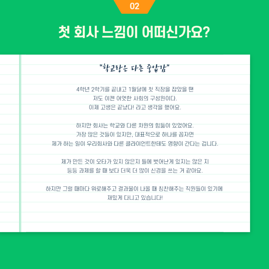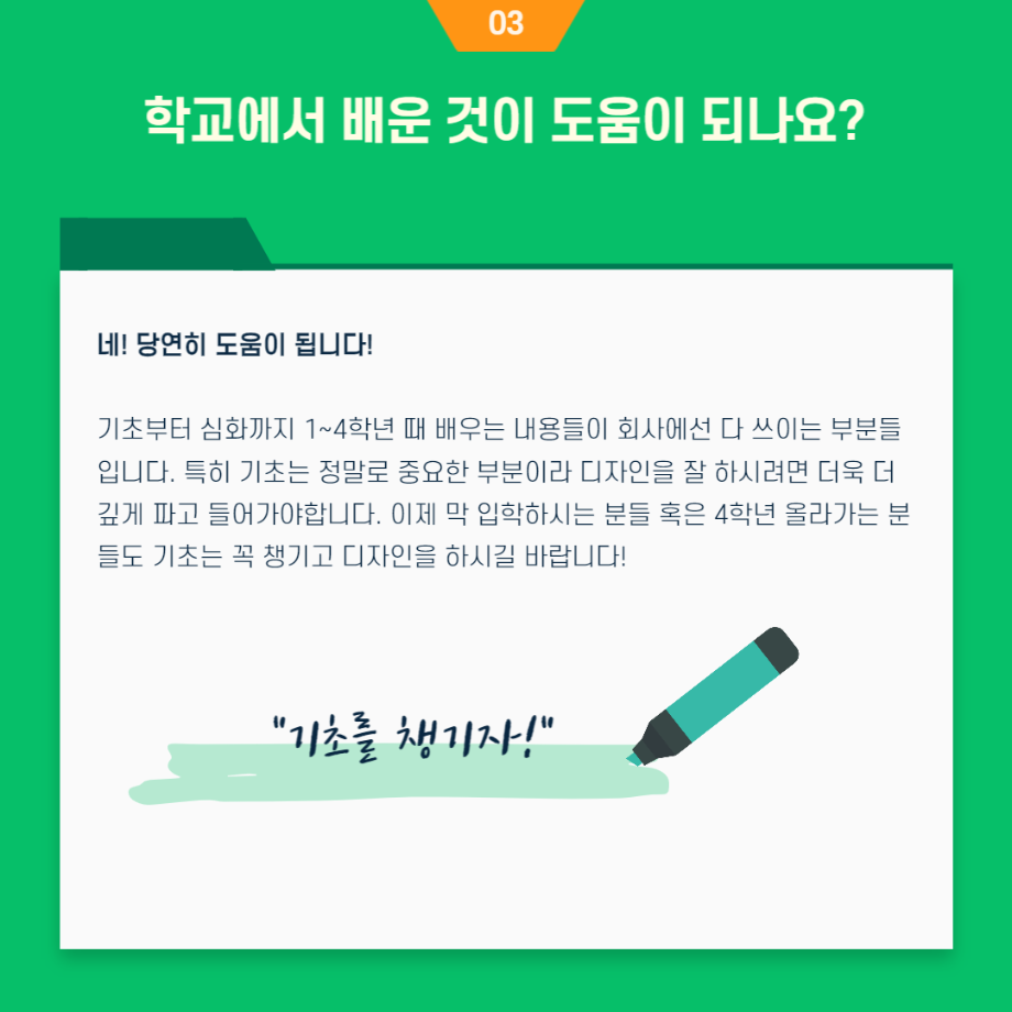 본문 시작 홈으로 입학/취업 학과소개 학과과정 시영소식 입학/취업 AI 학과자랑 SNS소통 홈페이지가이드 취업지금 입학여기 취업지금 전공소개 취업지금 페이스북 트위터 프린트 시각영상디자인학과 윤지훈 졸업생 - 가산디지털단지 디자인회사 취업! 시각영상디자인학과 2582 2023-03-29 목록 이전시각영상디자인학과 19학번 송나은 졸업생 - 서울 강남구 대치동 광고회사 취업! 다음 취업사례 중 대학원 진학 편 담당부서 : 시각영상디자인학과 담당자 : - 연락처 : 043-649-1726 최종수정일 : 2024-10-26 만족도조사 만족도 조사 이 페이지에서 제공하는 정보에 대하여 만족하시나요? 매우만족 만족 보통 불만족 매우불만족