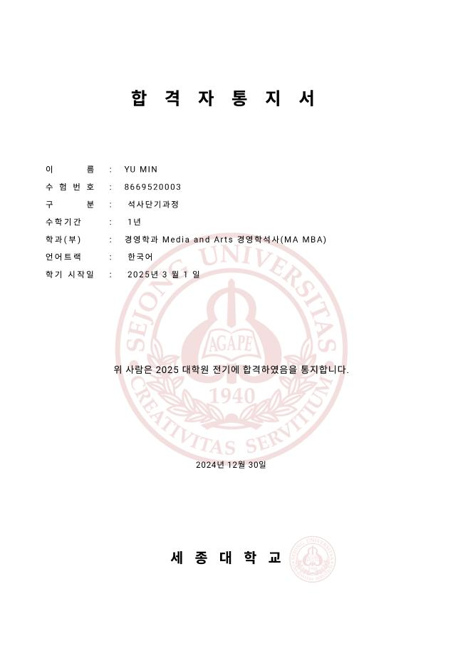 어* - 세종대 대학원 미디어 앤 아츠 경영학과 진학 (서울)