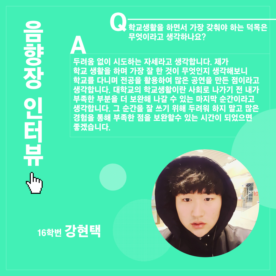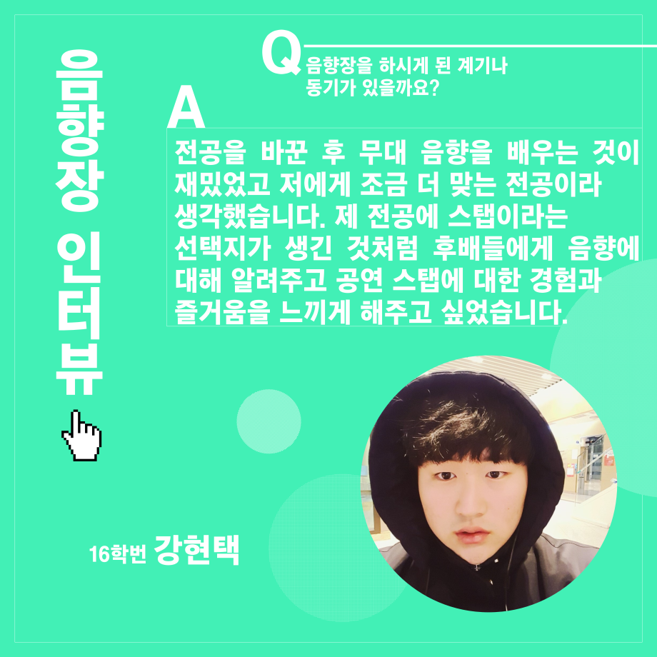 본문 시작 홈으로 학과소개 학과소개 입학정보 교수소개 학과과정 커뮤니티 공연예매 안내 홈페이지가이드 진로 학과개요 학과장인사말 학과연혁 세명대학교 민송아트홀 학과행사 진로 진로 페이스북 트위터 프린트 연기예술학과 음향장 인터뷰 연기예술학과 2572 2021-12-17 목록 이전연기예술학과 조명장 인터뷰 다음 연기예술학과 극장장 인터뷰 만족도조사 만족도 조사 이 페이지에서 제공하는 정보에 대하여 만족하시나요? 매우만족 만족 보통 불만족 매우불만족