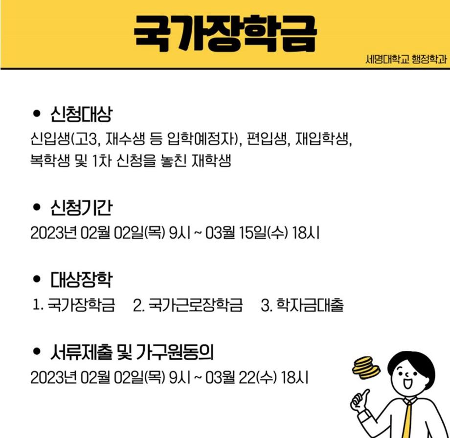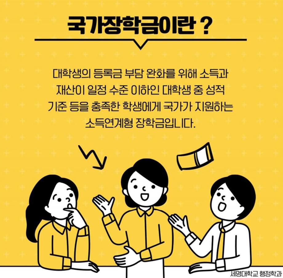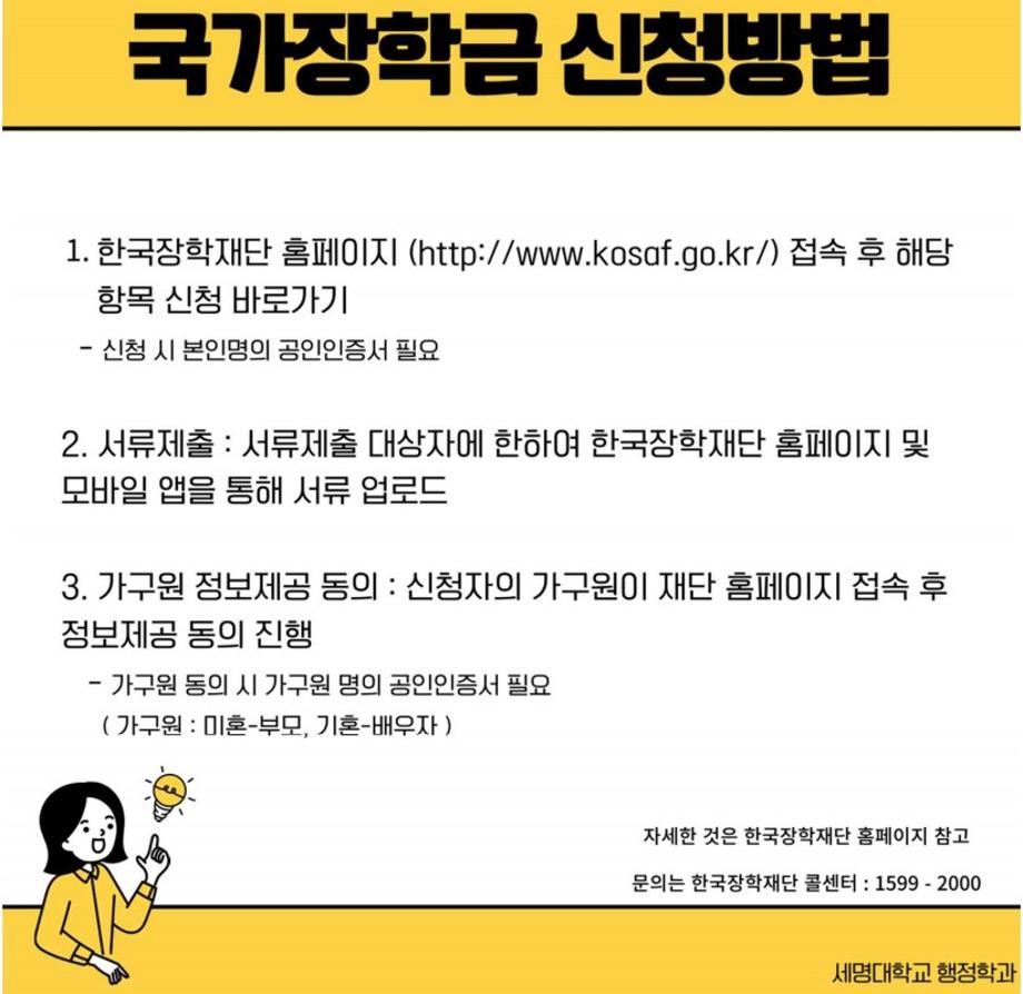 본문 시작 홈으로 학과소개 학과소개 교수소개 학과과정 커뮤니티 학과SNS 홈페이지가이드 카드뉴스 학과개요 학과장 인사말 학과연혁 교육목표 졸업 후 진로와 취업현황 학과행사 카드뉴스 입학안내 행정학 용어사전 카드뉴스 페이스북 트위터 프린트 📌2023-1학기 국가장학금 신청📌 행정학과 2505 2023-02-10 안녕하세요 신입생 여러분! 세명대학교 행정학과 입학을 축하드립니다! 신입생 여러분들이라면 꼭! 신청하셔야 할 국가장학금 신청방법에 대해 다음과 같이 안내드립니다 :-D 📌 신청시 주의할 점 1. 실제 재학 중인 학생(본인) 명의로 신청하기 2. 명칭이 비슷한 장학금들이 많으므로 타 장학금으로 신청하지 않게 주의하기 3. 기간 내 서류, 가구원 정보제공 동의하기 목록 이전🎉세명대 행정학과 공무원 합격 현수막🎉 다음 2023년도 제천시 전입장학금 안내 만족도조사 만족도 조사 이 페이지에서 제공하는 정보에 대하여 만족하시나요? 매우만족 만족 보통 불만족 매우불만족