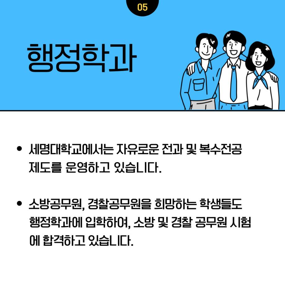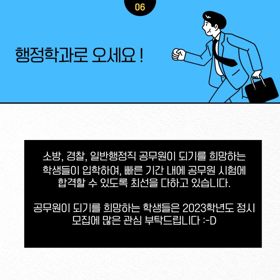본문 시작 홈으로 학과소개 학과소개 교수소개 학과과정 커뮤니티 학과SNS 홈페이지가이드 입학안내 학과개요 학과장 인사말 학과연혁 교육목표 졸업 후 진로와 취업현황 학과행사 카드뉴스 입학안내 행정학 용어사전 입학안내 페이스북 트위터 프린트 📝2023학년도 행정학과 정시 모집📝 행정학과 2469 2022-12-30 안녕하세요! 2022년 12월 29일부터 2023년 1월 2일까지 세명대학교 행정학과 정시모집 원서접수 기간입니다. 공무원이 되기를 희망하는 학생들을 환영합니다🤗많은 관심과 지원 바랍니다~‼ 목록 이전[이벤트] 2023학년도 정시모집 지원학생(희망자)들을 위한 sns 이벤트! 만족도조사 만족도 조사 이 페이지에서 제공하는 정보에 대하여 만족하시나요? 매우만족 만족 보통 불만족 매우불만족