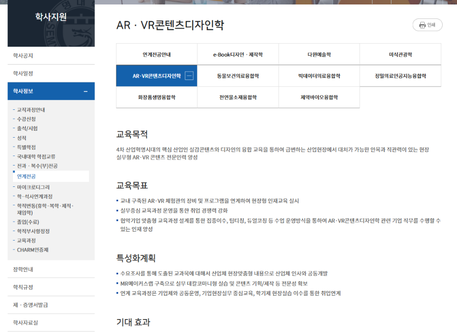 본문 시작 홈으로 학과과정 학과소개 학과과정 시영소식 입학/취업 AI 학과자랑 SNS소통 홈페이지가이드 AR·VR 연계전공 교육과정 모듈형교육과정 전공교육 체계도 AR·VR 연계전공 AR·VR 연계전공 페이스북 트위터 프린트 ARVR 연계 전공 소개 영상 시각영상디자인학과 491 2025-09-06 ARVR 연계 전공 소개 영상 https://www.semyung.ac.kr/kor/sub04_03_13_16.do 목록 이전호유당(제천약초한과)브랜드 리브랜딩- 수업과제 담당부서 : 시각영상디자인학과 담당자 : - 연락처 : 043-649-1726 최종수정일 : 2024-10-26 만족도조사 만족도 조사 이 페이지에서 제공하는 정보에 대하여 만족하시나요? 매우만족 만족 보통 불만족 매우불만족