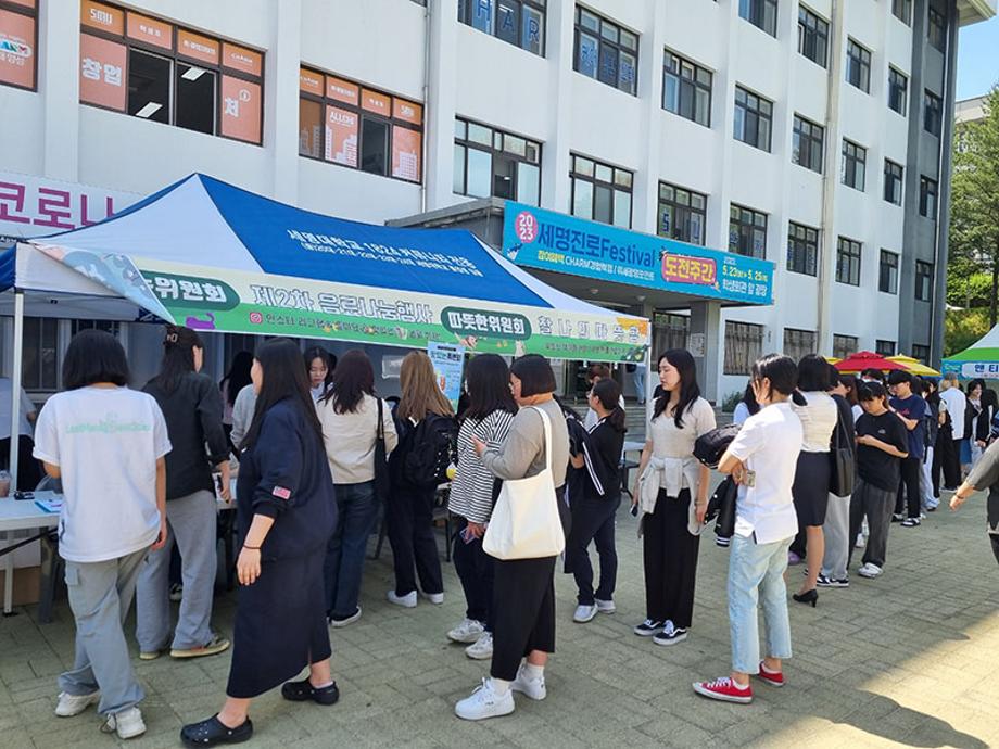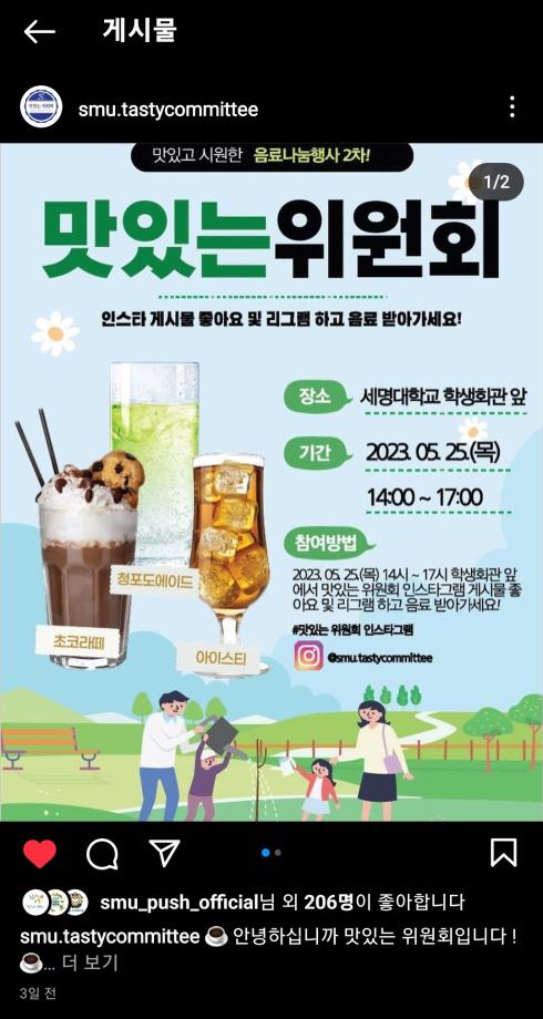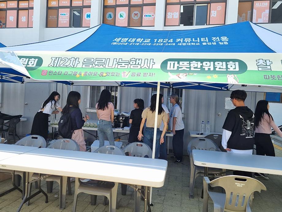 본문 시작 홈으로 포토갤러리 학생위원회 개요 학생위원회 소개 공지사항 활동결과 홈페이지가이드 포토갤러리 페이스북 트위터 프린트 [맛있는 위원회]제 2회 음료나눔행사 학생처 3356 2023-06-01 세명대학교 재미있는 경험을 위한 학생위원회 중 '맛있는 위원회'는 5월 25일(목) 14시부터 17시까지 학생회관 앞에서 음료나눔행사를 진행하였다. 음료 메뉴는 5월 18일 청룡체전기간 동안 진행한 설문조사 결과를 반영하여 선정하였고, 초코라떼, 청포도에이드, 아이스티, 커피 음료를 제공하였다. 추가로, '맛있는위원회'는 이날 음료나눔행사를 통해 공식 SNS를 공유하여 본교 구성원과의 소통을 위한 자리를 가졌다. 목록 이전[알려주는 위원회] 너의MBTI를 알려줘 다음 [따뜻한 위원회] 찰나의 따뜻함 담당부서 : 장학복지팀 담당자 : - 연락처 : 043-649-1142 최종수정일 : 2024-10-26 만족도조사 만족도 조사 이 페이지에서 제공하는 정보에 대하여 만족하시나요? 매우만족 만족 보통 불만족 매우불만족