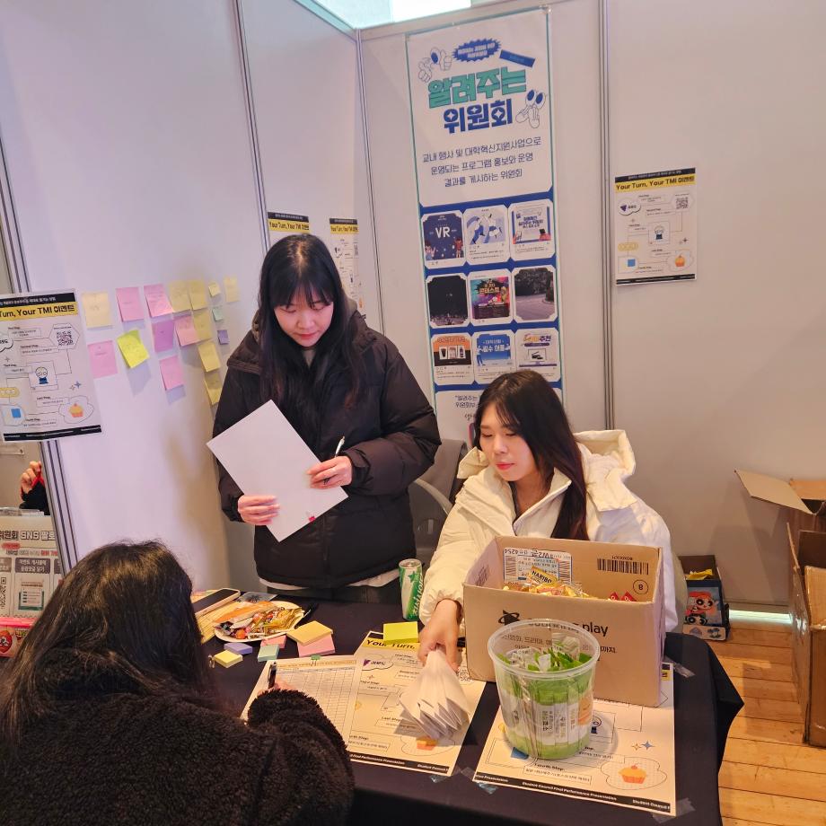 본문 시작 홈으로 포토갤러리 학생위원회 개요 학생위원회 소개 공지사항 활동결과 홈페이지가이드 포토갤러리 페이스북 트위터 프린트 [알려주는 위원회] 최종보고회 부스운영 대학혁신지원단 2953 2023-11-22 <알려주는 위원회 활동 결과 내용> [알려주는 위원회] 알려주는 위원회 Your Turn, Your TMI 역질문 이벤트 1. 행사일시: 2023년 11월 16일(목) 11:30~18:00 -제2회 학생위원회 최종보고회 기간 2. 행사장소: 학술관 1층 로비(알려주는 위원회 부스) 3. 행사내용 1) 알려주는 위원회 상담 및 가신청 2) 알려주는 위원회 팔로우 및 역질문 답글 달기 이벤트 3) 간식 나눔 4. 참여인원: 107명 목록 이전[통하는 위원회] 최종보고회 부스 이전[생각하는 위원회] 제 2회 멍때리기 대회 담당부서 : 장학복지팀 담당자 : - 연락처 : 043-649-1142 최종수정일 : 2024-10-26 만족도조사 만족도 조사 이 페이지에서 제공하는 정보에 대하여 만족하시나요? 매우만족 만족 보통 불만족 매우불만족