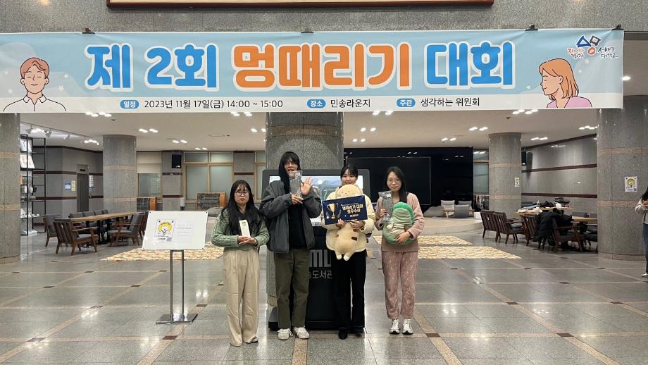 본문 시작 홈으로 포토갤러리 학생위원회 개요 학생위원회 소개 공지사항 활동결과 홈페이지가이드 포토갤러리 페이스북 트위터 프린트 [생각하는 위원회] 제 2회 멍때리기 대회 학술정보 2138 2023-11-17 <제 2회 멍때리기 대회> 일시 : 2023.11.17(금)14:00 참여자 : 17명 수상상품 : 1등_바디필로우 2등_춘식이 팔쿠션 3등_스피디 보조배터리 베스트드레서상_ 장갑 목록 다음 [알려주는 위원회] 최종보고회 부스운영 다음 [꽃피는 위원회] 제 3회 벚꽃축제 담당부서 : 장학복지팀 담당자 : - 연락처 : 043-649-1142 최종수정일 : 2024-10-26 만족도조사 만족도 조사 이 페이지에서 제공하는 정보에 대하여 만족하시나요? 매우만족 만족 보통 불만족 매우불만족