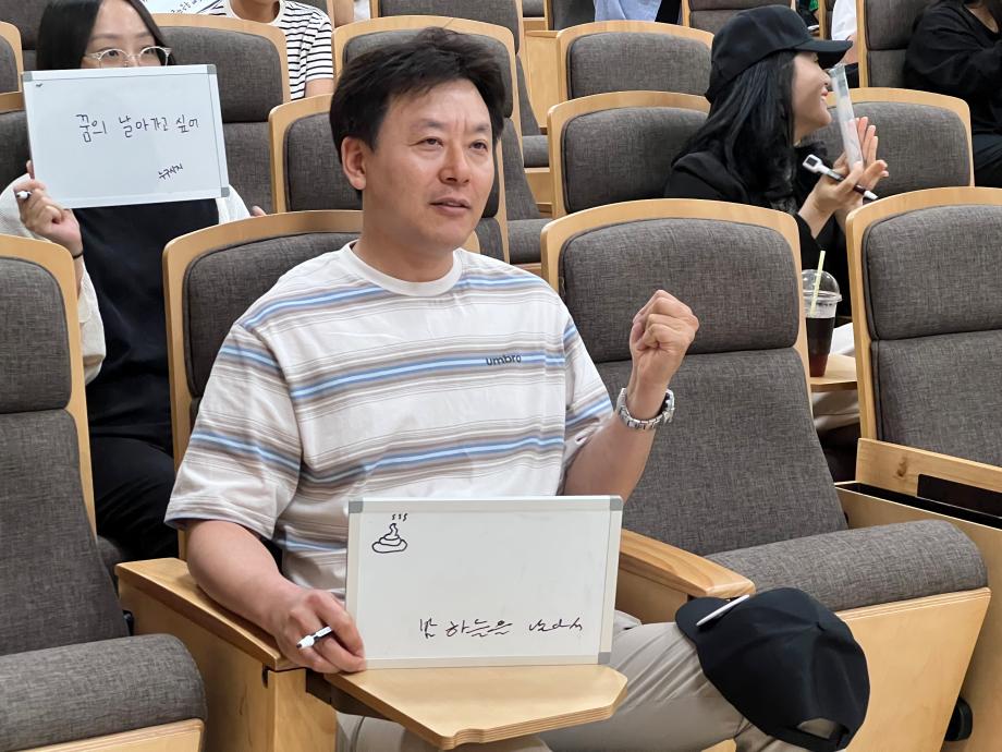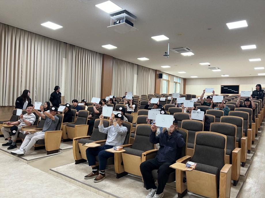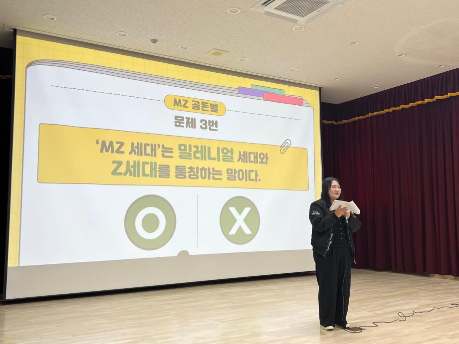 본문 시작 홈으로 포토갤러리 학생위원회 개요 학생위원회 소개 공지사항 활동결과 홈페이지가이드 포토갤러리 페이스북 트위터 프린트 [통하는 위원회]MZ 골든벨 대학혁신지원단 1850 2024-06-07 1) 행사일시 : 2024.05.07.(목) 14:00 2) 행사장소 : 민송도서관 S:MU 콘텐츠홀 3) 행사내용 : MZ 세대와 X 세대 문화를 주제로 골든벨을 개최하여 교직원들과 학생들이 서로의 문화를 배우고 가까워질 수 있는 계기를 마련 4) 참여인원 : 38명 - 통하는 위원회 13명 - 참여자 25명 (교수 3명, 조교 9명, 직원 12명) 목록 이전[통하는 위원회] MZ력 & X력 테스트 다음 [밀어주는 위원회] 꿈실현장학금 장학증서 수여식 담당부서 : 장학복지팀 담당자 : - 연락처 : 043-649-1142 최종수정일 : 2024-10-26 만족도조사 만족도 조사 이 페이지에서 제공하는 정보에 대하여 만족하시나요? 매우만족 만족 보통 불만족 매우불만족