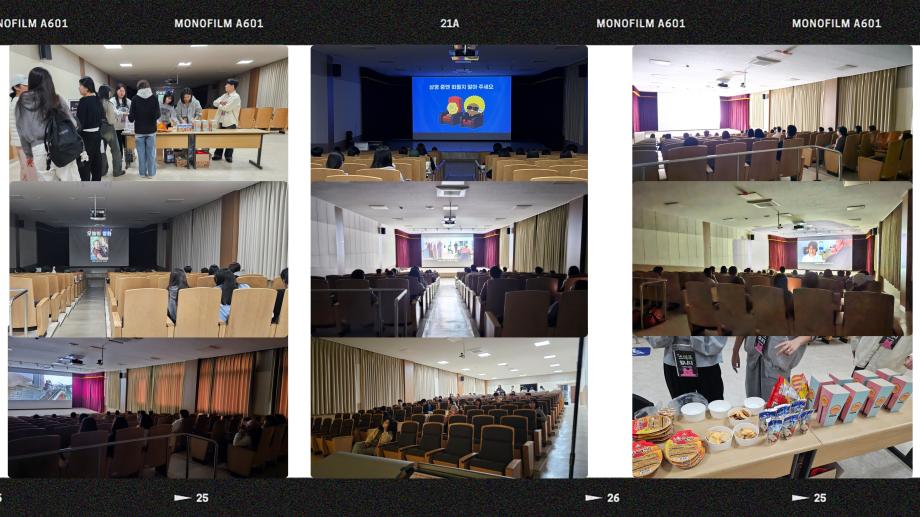 활동내용 : 제천시 내의 영화관이 사라짐에 따라 대학 구성원이 영화를 보기 어려워져 무비데이를 맞이하여 문화생활을 향유할 수 있도록 영화 상영, 영화를 보며 먹을 수 있는 간식 제공