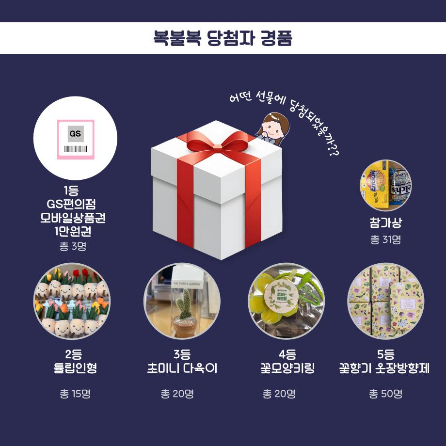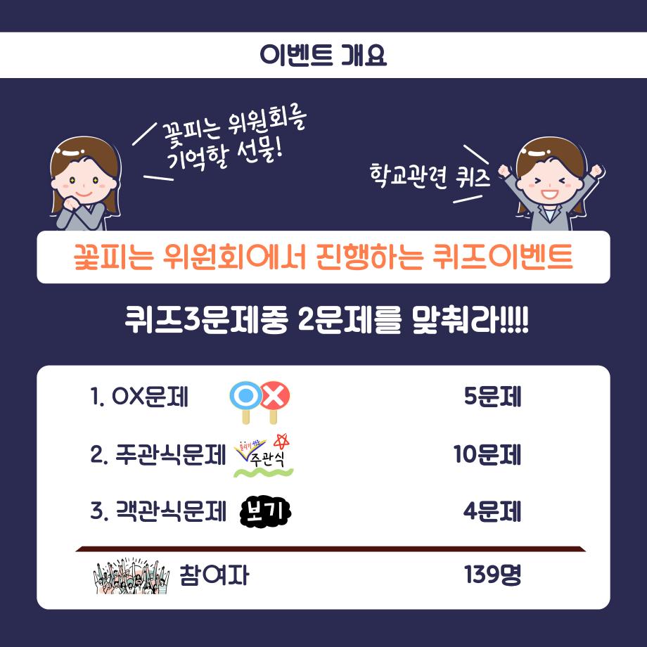 내용 : 꽃피는 위원회는 우리 위원회 및 학생위원회를 알리기 위하여 위원회 퀴즈이벤트를 실시하였다. 총 139명의 구성원들이 참여하여 본교 및 위원회 관련 퀴즈를 풀고 복불복으로 경품을 수령하여 즐겁고 힐링되는 시간을 제공하였다