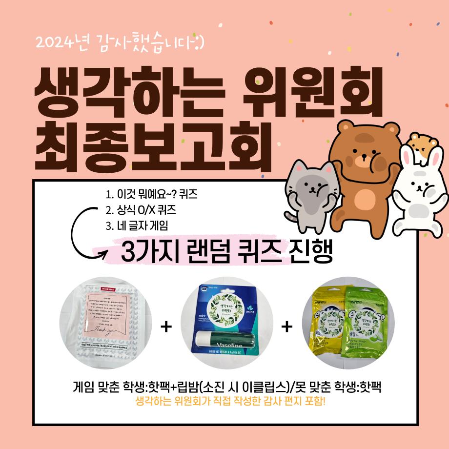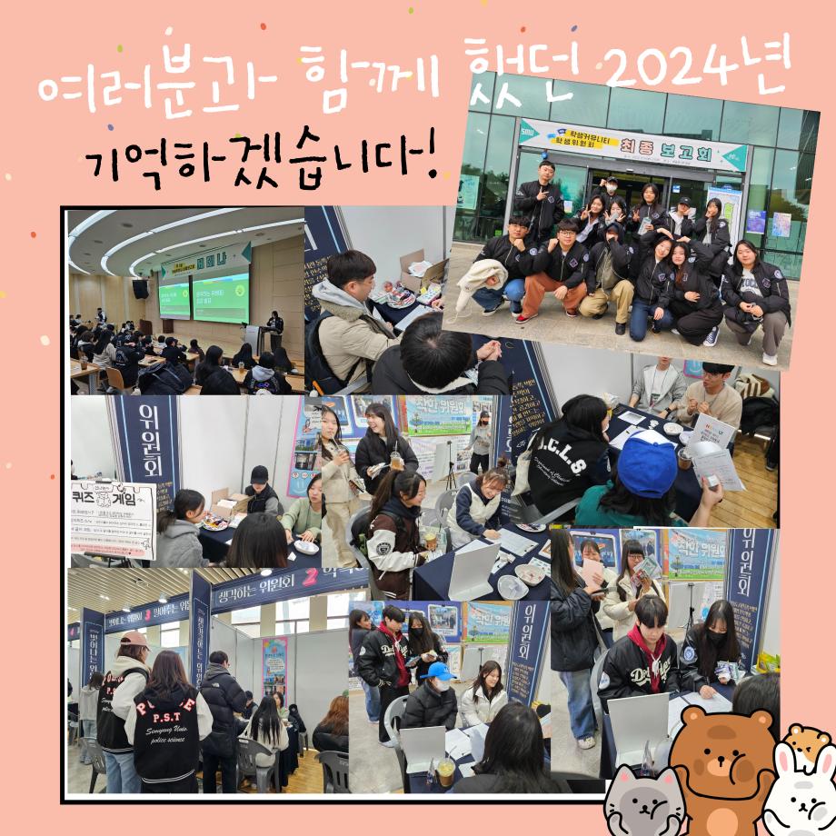 본문 시작 홈으로 포토갤러리 학생위원회 개요 학생위원회 소개 공지사항 활동결과 홈페이지가이드 포토갤러리 페이스북 트위터 프린트 [생각하는 위원회] 최종보고회 감사이벤트 학술정보원 1692 2024-11-25 일시 : 2024.11.21(목) 장소 : 학술관 1층 로비 활동내용 : 생각하는 위원회 상담 및 가신청, 게임 진행하여 상품 전달 참여인원 : 154명 올해 생각하는 위원회를 사랑해주신 학생 여러분께 감사의 말씀 전합니다. 작게나마 최종보고회 부스를 통해 감사함을 전달할 수 있는 좋은 시간이었습니다. 2025년 학생위원회 많은 관심 부탁드립니다:) 감사합니다! 목록 이전[용감한 위원회]도전! 인테리어 창업 체험부츠 운영 이전[생각하는 위원회] 사과데이 담당부서 : 장학복지팀 담당자 : - 연락처 : 043-649-1142 최종수정일 : 2024-10-26 만족도조사 만족도 조사 이 페이지에서 제공하는 정보에 대하여 만족하시나요? 매우만족 만족 보통 불만족 매우불만족