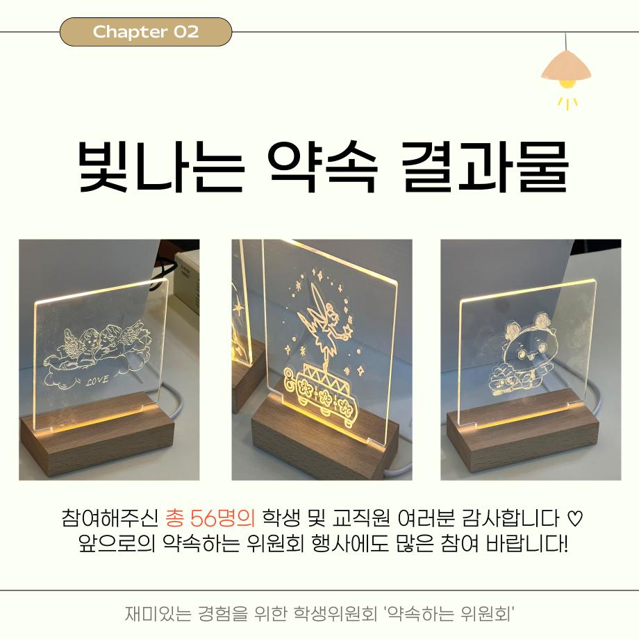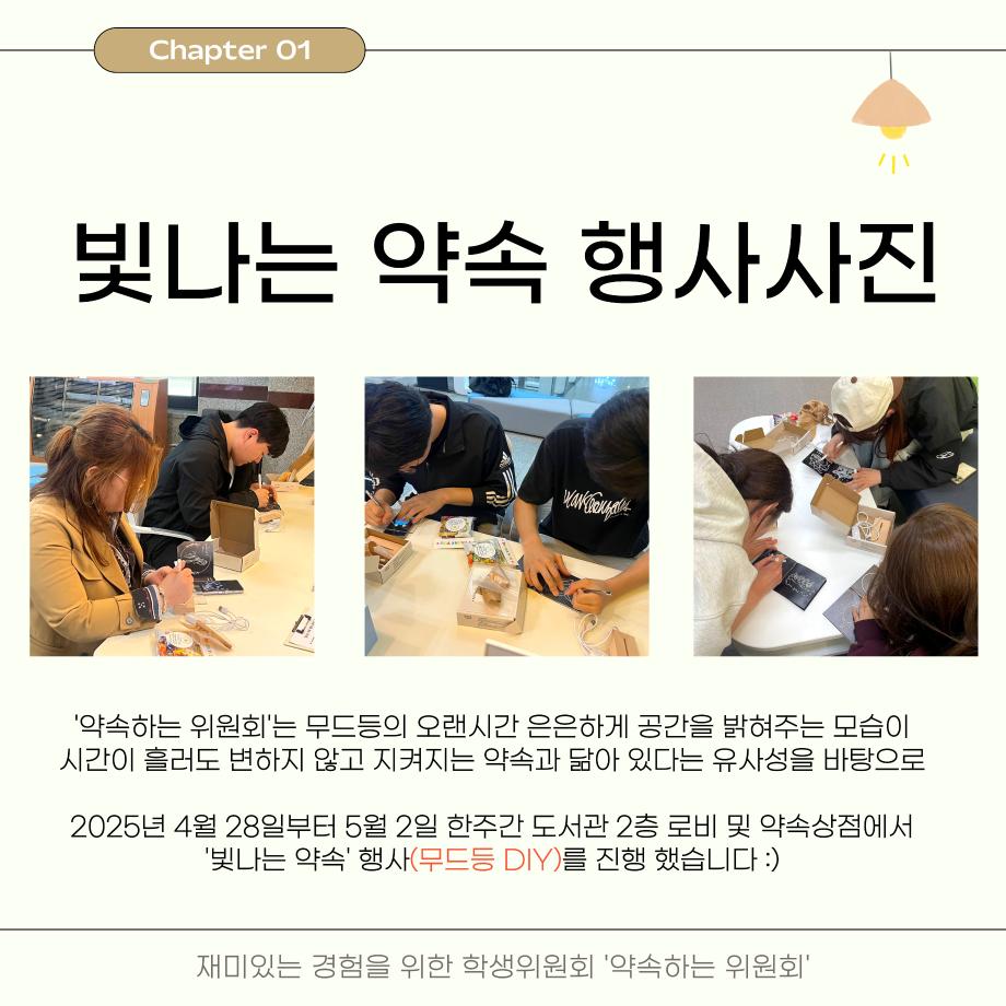 본문 시작 홈으로 포토갤러리 학생위원회 개요 학생위원회 소개 공지사항 활동결과 홈페이지가이드 포토갤러리 페이스북 트위터 프린트 [약속하는 위원회] 빛나는 약속 학술정보원 1047 2025-05-13 안녕하세요 재미있는 경험을 위한 학생위원회 '약속하는 위원회' 입니다! 약속하는 위원회 행사인 빛나는 약속 활동이 성황리에 마무리 되었습니다 :) [빛나는 약속 행사 결과] 일시 : 2025년 4월 28일(월) ~ 5월 2일(금) 장소 : 도서관 2층 로비 및 약속상점 행사 참여자 : 56명 빛나는 약속 행사에 참여해주신 모든 분들께 진심으로 감사드립니다! 추후에 이어질 약속하는 위원회 활동도 많은 관심 바랍니다! 목록 이전제 3기 학생위원회 최종보고회 다음 [생각하는 위원회]생각 다락방 담당부서 : 장학복지팀 담당자 : - 연락처 : 043-649-1142 최종수정일 : 2024-10-26 만족도조사 만족도 조사 이 페이지에서 제공하는 정보에 대하여 만족하시나요? 매우만족 만족 보통 불만족 매우불만족