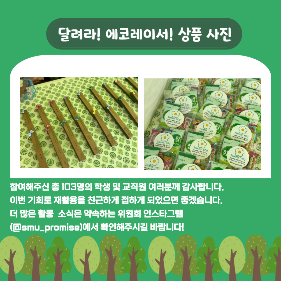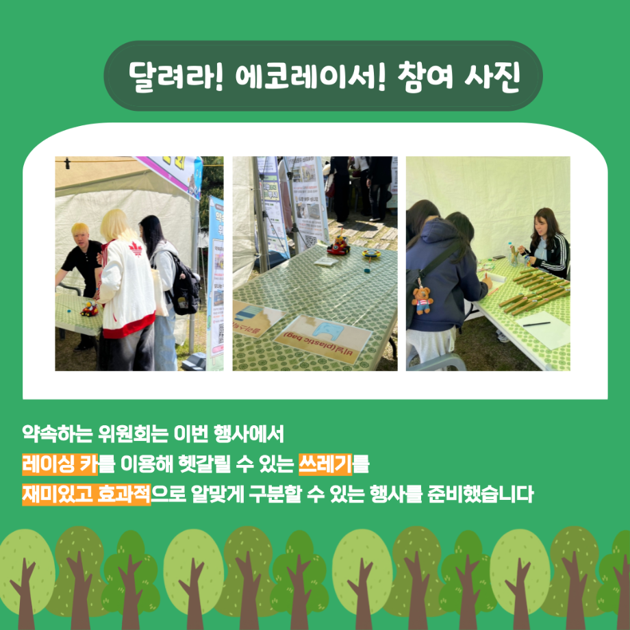 본문 시작 홈으로 포토갤러리 학생위원회 개요 학생위원회 소개 공지사항 활동결과 홈페이지가이드 포토갤러리 페이스북 트위터 프린트 [약속하는 위원회] 달려라 에코레이서 학술정보원 934 2025-05-15 안녕하세요 재미있는 경험을 위한 학생위원회 '약속하는 위원회' 입니다! 약속하는 위원회 행사인 달려라! 에코레이서! 활동이 성황리에 마무리 되었습니다 :) [달려라! 에코레이서! 행사 결과] 일시 : 2025년 5월 14일(수) 10:00 ~ 13:30 장소 : 뭐든지 광장 행사 참여자 : 103명 달려라! 에코레이서! 행사에 참여해주신 모든 분들께 진심으로 감사 드립니다! 추후에 이어질 약속하는 위원회 활동도 많은 관심 바랍니다! 목록 이전[꽃피는 위원회] 제4회 벚꽃축제 '벚꽃세봄' 다음 [꽃피는 위원회] 제 4회 사랑의 꽃집사 체험이벤트 담당부서 : 장학복지팀 담당자 : - 연락처 : 043-649-1142 최종수정일 : 2024-10-26 만족도조사 만족도 조사 이 페이지에서 제공하는 정보에 대하여 만족하시나요? 매우만족 만족 보통 불만족 매우불만족