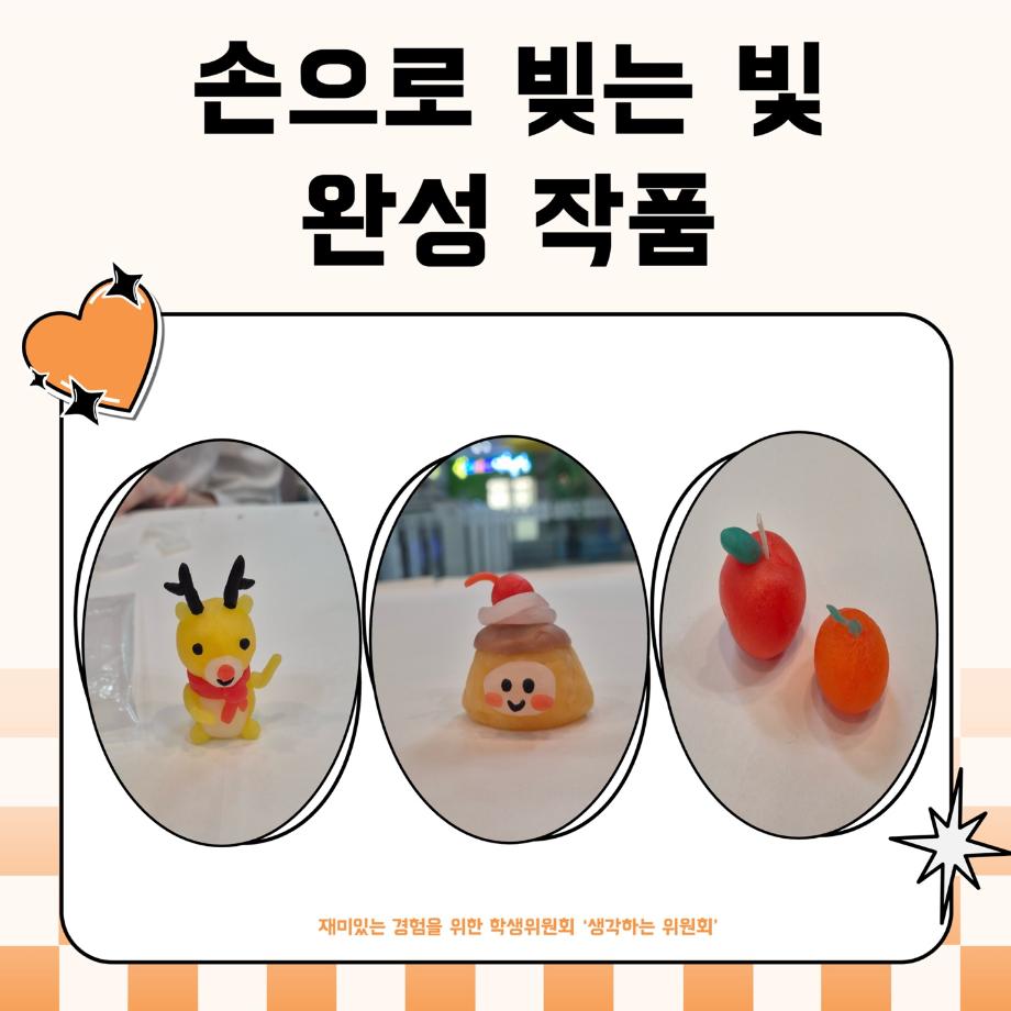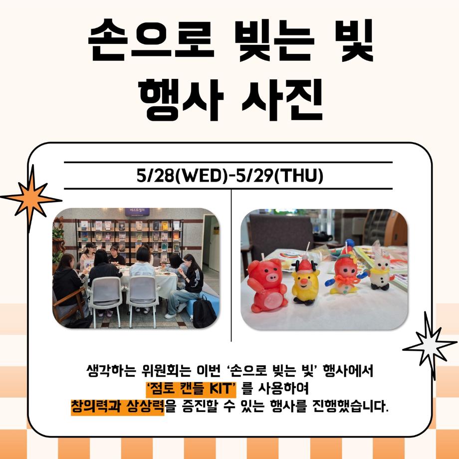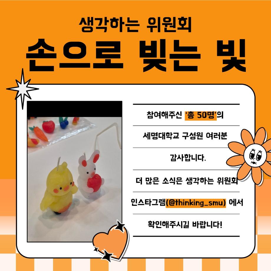 본문 시작 홈으로 포토갤러리 학생위원회 개요 학생위원회 소개 공지사항 활동결과 홈페이지가이드 포토갤러리 페이스북 트위터 프린트 [생각하는 위원회] 손으로 빚는 빛 학술정보원 1200 2025-05-30 프로그램명 : 손으로 빚는 빛 일시 : 2025년 5월 28일(수)~29일(목) 13:30~16:00 장소 : 도서관 2층 로비 활동내용 : 점토양초 DIY로 나만의 양초 만들기 행사 참여자 : 50명 안녕하세요! 재미있는 경험을 위한 학생위원회 '생각하는 위원회'입니다 :) 손으로 빚는 빛 행사에 참여해주신 모든 분들께 감사드립니다! 앞으로도 생각하는 위원회의 활동들에 많은 관심 부탁드립니다🤍 목록 다음 [생각하는 위원회] 대형 현수막 문구 공모전 'Hear, 위로' 다음 [약속하는 위원회] 뽕뽕오락실 담당부서 : 장학복지팀 담당자 : - 연락처 : 043-649-1142 최종수정일 : 2024-10-26 만족도조사 만족도 조사 이 페이지에서 제공하는 정보에 대하여 만족하시나요? 매우만족 만족 보통 불만족 매우불만족