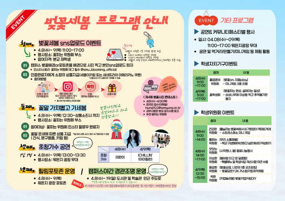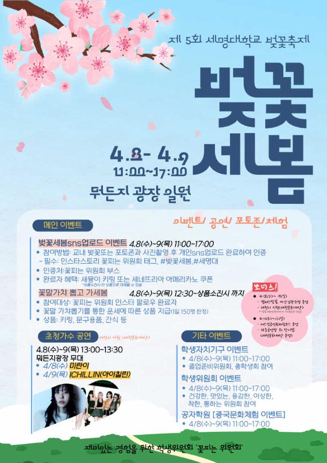 본문 시작 홈으로 공지사항 학생위원회 개요 학생위원회 소개 공지사항 활동결과 홈페이지가이드 프로그램 계획 프로그램 계획 세명대학교 공지사항 프로그램 계획 페이스북 트위터 프린트 [꽃피는 위원회] 제 5회 세명대학교 벚꽃축제 벚꽃세봄 학생처 15 2026-04-08 세명대학교 제 5회 벚꽃축제 [벚꽃세봄] 1. 일시:2026.04.08(수)~09(목) 2. 장소:뭐든지광장 일원 3. 내용: 포토존, 공연, 이벤트, 처험 등 각종 프로그램 진행 * 제 11회 커뮤니티 페스티벌과 함께 진행 목록 다음 [용감한 위원회] 벚꽃상점, 나만의 1호 굿즈 런칭 이전[생각하는 위원회] 현수막 공모전: 너도 도전해봐! 무한도전!🫧 담당부서 : 장학복지팀 담당자 : - 연락처 : 043-649-1142 최종수정일 : 2024-10-26 만족도조사 만족도 조사 이 페이지에서 제공하는 정보에 대하여 만족하시나요? 매우만족 만족 보통 불만족 매우불만족