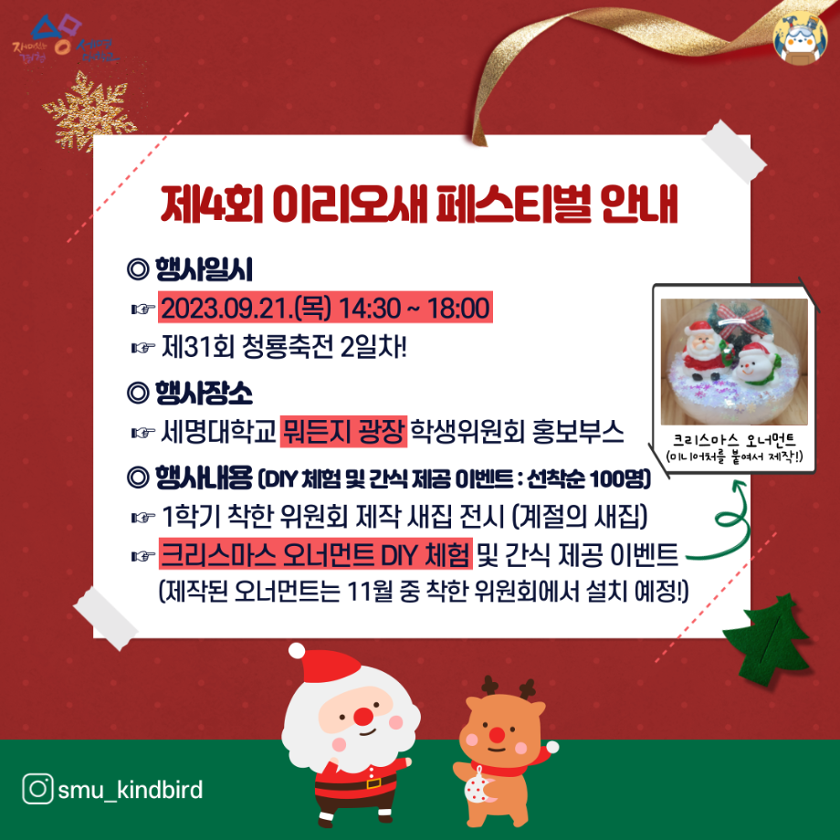 본문 시작 홈으로 공지사항 학생위원회 개요 학생위원회 소개 공지사항 활동결과 홈페이지가이드 프로그램 계획 프로그램 계획 세명대학교 공지사항 프로그램 계획 페이스북 트위터 프린트 [착한 위원회] 제 4회 이리오새 페스티벌 미리메리크리스마스 학생처 4226 2023-09-21 제4회 이리오새 페스티벌 1. 행사일시 : 2023년 09월 21일(목), 14:30~18:00 2. 행사장소 : 본교 뭐든지 광장 학생위원회 홍보부스 3. 행사내용 - 새집 전시회 (착한 위원회 제작, 계절을 담은 새집) - 크리스마스 오너먼트 DIY 체험 및 간식 나눔 이벤트 (선착순 100명) 목록 이전청룡축전기간 학생위원회 활동 다음 [착한 위원회]2023학년도 2학기 포롱포롱공방 체험자 모집 담당부서 : 장학복지팀 담당자 : - 연락처 : 043-649-1142 최종수정일 : 2024-10-26 만족도조사 만족도 조사 이 페이지에서 제공하는 정보에 대하여 만족하시나요? 매우만족 만족 보통 불만족 매우불만족