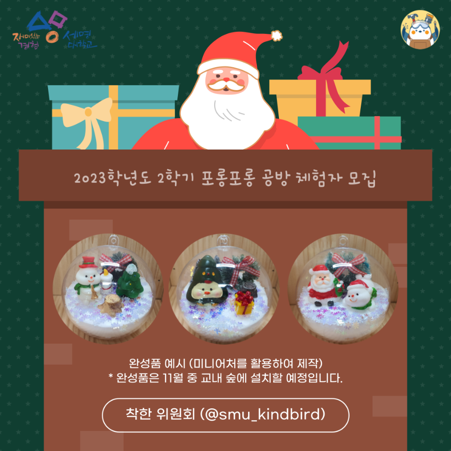 본문 시작 홈으로 공지사항 학생위원회 개요 학생위원회 소개 공지사항 활동결과 홈페이지가이드 프로그램 계획 프로그램 계획 세명대학교 공지사항 프로그램 계획 페이스북 트위터 프린트 [착한 위원회]2023학년도 2학기 포롱포롱공방 체험자 모집 학생처 2569 2023-10-18 [착한 위원회] 포롱포롱 공방 체험자 모집 1. 운영기간 : 10/23(월) ~ 10/27(금) 2. 신청기간 : 10/18(수) ~ 10/19(목) - 구글 폼을 통하여 신청 - https://forms.gle/QrF4pF8EUeXmBy6RA 목록 이전[착한 위원회] 제 4회 이리오새 페스티벌 미리메리크리스마스 다음 [통하는 위원회] MZ골든벨 담당부서 : 장학복지팀 담당자 : - 연락처 : 043-649-1142 최종수정일 : 2024-10-26 만족도조사 만족도 조사 이 페이지에서 제공하는 정보에 대하여 만족하시나요? 매우만족 만족 보통 불만족 매우불만족