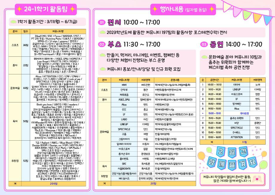 본문 시작 홈으로 공지사항 학생위원회 개요 학생위원회 소개 공지사항 활동결과 홈페이지가이드 프로그램 계획 프로그램 계획 세명대학교 공지사항 프로그램 계획 페이스북 트위터 프린트 [춤추는 위원회] 커뮤니티 페스티벌 축하공연 학생처 1771 2024-04-02 춤추는 위원회에서 제 9회 커뮤니티 페스티벌 축하공연에 참여합니다. 많은 관람 부탁드립니다. 목록 다음 [약속하는 위원회] 2024년도 약속상점 운영안내 다음 [꽃피는 위원회] 벚꽃사진콘테스트 담당부서 : 장학복지팀 담당자 : - 연락처 : 043-649-1142 최종수정일 : 2024-10-26 만족도조사 만족도 조사 이 페이지에서 제공하는 정보에 대하여 만족하시나요? 매우만족 만족 보통 불만족 매우불만족