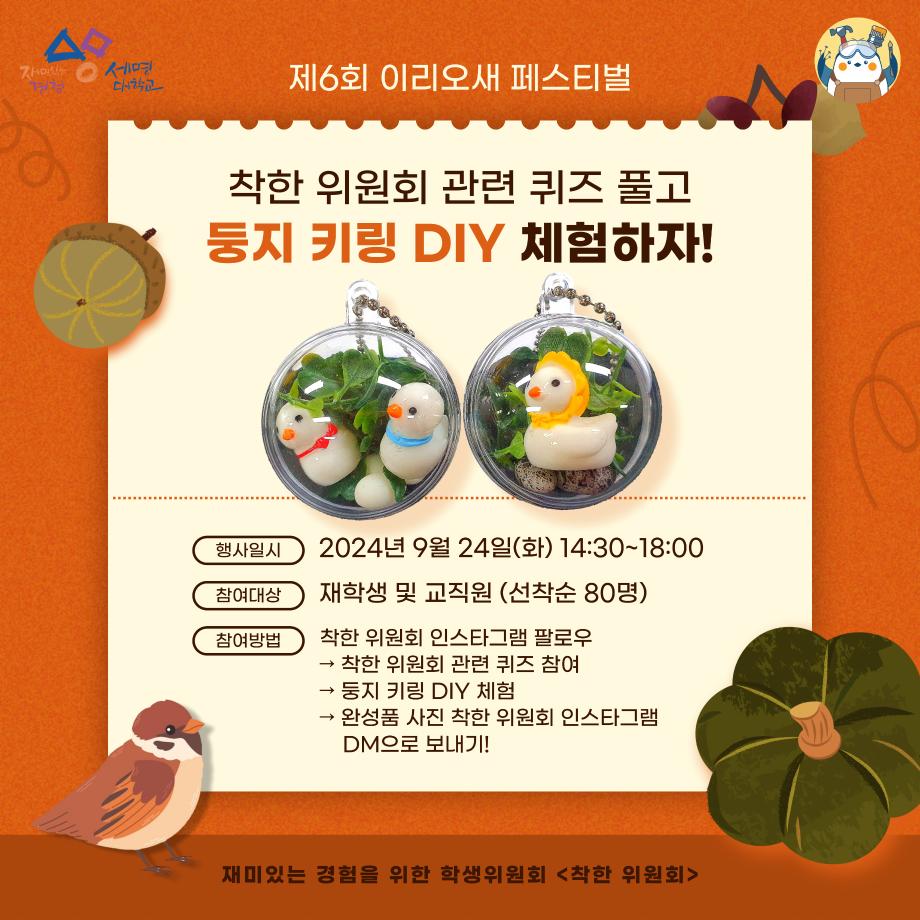 본문 시작 홈으로 공지사항 학생위원회 개요 학생위원회 소개 공지사항 활동결과 홈페이지가이드 프로그램 계획 프로그램 계획 세명대학교 공지사항 프로그램 계획 페이스북 트위터 프린트 [착한 위원회] 제6회 이리오새 페스티벌 학생처 1043 2024-09-19 [착한 위원회] 제6회 이리오새 페스티벌 1. 행사일시 : 2024년 9월 24일(화), 14시 30분~18시 2. 행사장소 : 본교 뭐든지광장 착한 위원회 부스 3. 행사내용 - 착한 위원회 및 체험자 제작 새집 전시회(2022~2024학년도) - 착한 위원회 관련 퀴즈 및 둥지 키링 DIY 체험(선착순 80명, 본교 재학생 및 교직원 대상) 목록 이전[생각하는 위원회] 해먹만족도 조사 다음 [꽃피는 위원회] 비즈반지 만들기 담당부서 : 장학복지팀 담당자 : - 연락처 : 043-649-1142 최종수정일 : 2024-10-26 만족도조사 만족도 조사 이 페이지에서 제공하는 정보에 대하여 만족하시나요? 매우만족 만족 보통 불만족 매우불만족