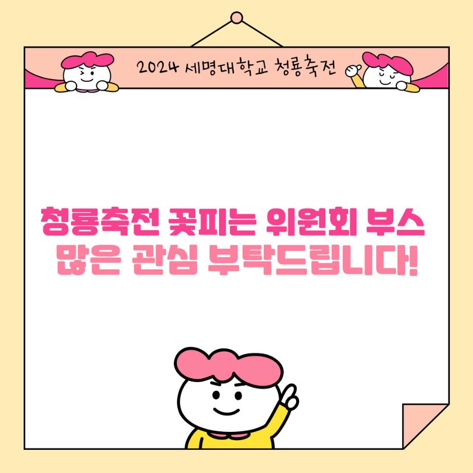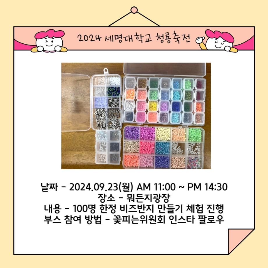 본문 시작 홈으로 공지사항 학생위원회 개요 학생위원회 소개 공지사항 활동결과 홈페이지가이드 프로그램 계획 프로그램 계획 세명대학교 공지사항 프로그램 계획 페이스북 트위터 프린트 [꽃피는 위원회] 비즈반지 만들기 학생처 1071 2024-09-19 [꽃피는 위원회] 비즈반지 만들기 일시 : 2024.09.23(월) 11:00 ~ 14:30 장소 : 뭐든지광장 학생위원회 부스 참여조건 : 꽃피는 위원회 인스타 팔로우 또는 꽃피는 위원회 활동만족도 조사 참여자 내용 : 꽃파츠를 활용한 비즈반지 만들기 체험 진행 목록 이전[착한 위원회] 제6회 이리오새 페스티벌 다음 [따뜻한 위원회] 걱정인형 키링 만들기 담당부서 : 장학복지팀 담당자 : - 연락처 : 043-649-1142 최종수정일 : 2024-10-26 만족도조사 만족도 조사 이 페이지에서 제공하는 정보에 대하여 만족하시나요? 매우만족 만족 보통 불만족 매우불만족