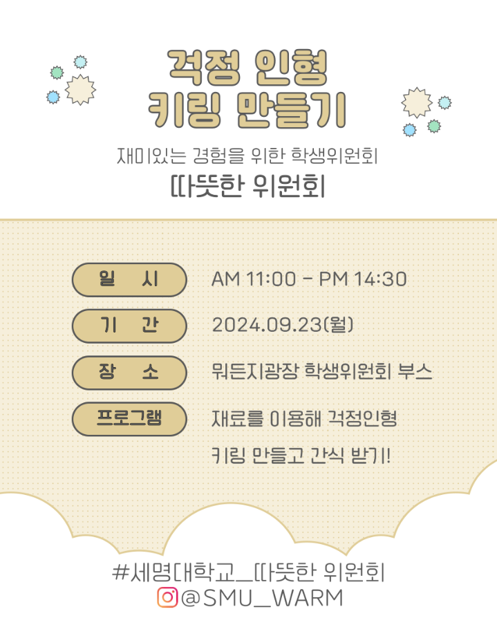 본문 시작 홈으로 공지사항 학생위원회 개요 학생위원회 소개 공지사항 활동결과 홈페이지가이드 프로그램 계획 프로그램 계획 세명대학교 공지사항 프로그램 계획 페이스북 트위터 프린트 [따뜻한 위원회] 걱정인형 키링 만들기 학생처 1208 2024-09-19 [따뜻한 위원회] 걱정인형 키링 만들기 일시 : 2024.09.23(월) 11:00 ~ 14:30 장소 : 뭐든지광장 학생위원회 부스 내용 : '나의 걱정과 불안을 부탁해' 걱정인형 키링 만들기 및 따뜻한 마음이 담긴 간식나눔이벤트 실시 목록 이전[꽃피는 위원회] 비즈반지 만들기 다음 [학생위원회] 제 32대 청룡축전기간 활동 안내 담당부서 : 장학복지팀 담당자 : - 연락처 : 043-649-1142 최종수정일 : 2024-10-26 만족도조사 만족도 조사 이 페이지에서 제공하는 정보에 대하여 만족하시나요? 매우만족 만족 보통 불만족 매우불만족