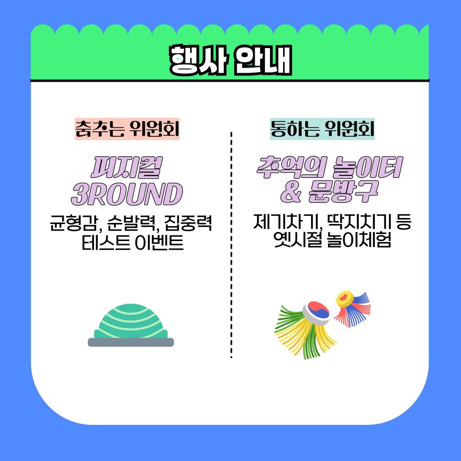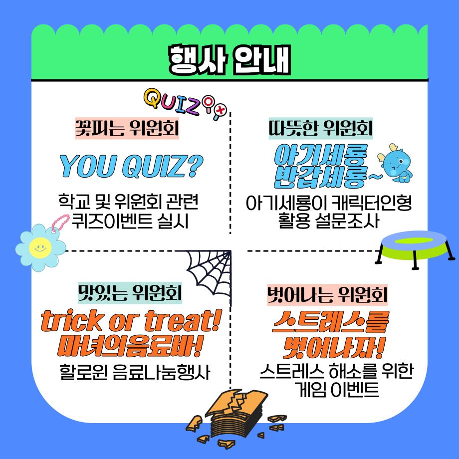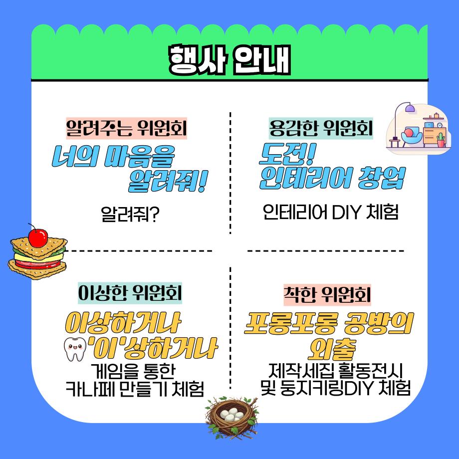 본문 시작 홈으로 공지사항 학생위원회 개요 학생위원회 소개 공지사항 활동결과 홈페이지가이드 프로그램 계획 프로그램 계획 세명대학교 공지사항 프로그램 계획 페이스북 트위터 프린트 학생위원회 연합행사(10개) 학생처 1194 2024-10-30 2024학년도 재미있는 경험을 위한 학생위원회 13개 위원회 중 10개위원회에서 오는 10/30(수)에 아래와 같이 연합행사를 진행합니다. 많은 참여부탁드립니다. 일시 : 2024.10.30(수) 11:30 ~ 14:30 장소 : 학생회관 앞 광장(세명스퀘어) 참여위원회 : 꽃피는 위원회, 따뜻한 위원회, 맛있는 위원회, 벗어나는 위원회, 알려주는 위원회, 용감한 위원회, 이상한 위원회, 착한 위원회, 통하는 위원회, 춤추는 위원회 목록 이전[약속하는 위원회] 무비데이 다음 [알려주는 위원회] 너의 마음을 알려줘 담당부서 : 장학복지팀 담당자 : - 연락처 : 043-649-1142 최종수정일 : 2024-10-26 만족도조사 만족도 조사 이 페이지에서 제공하는 정보에 대하여 만족하시나요? 매우만족 만족 보통 불만족 매우불만족