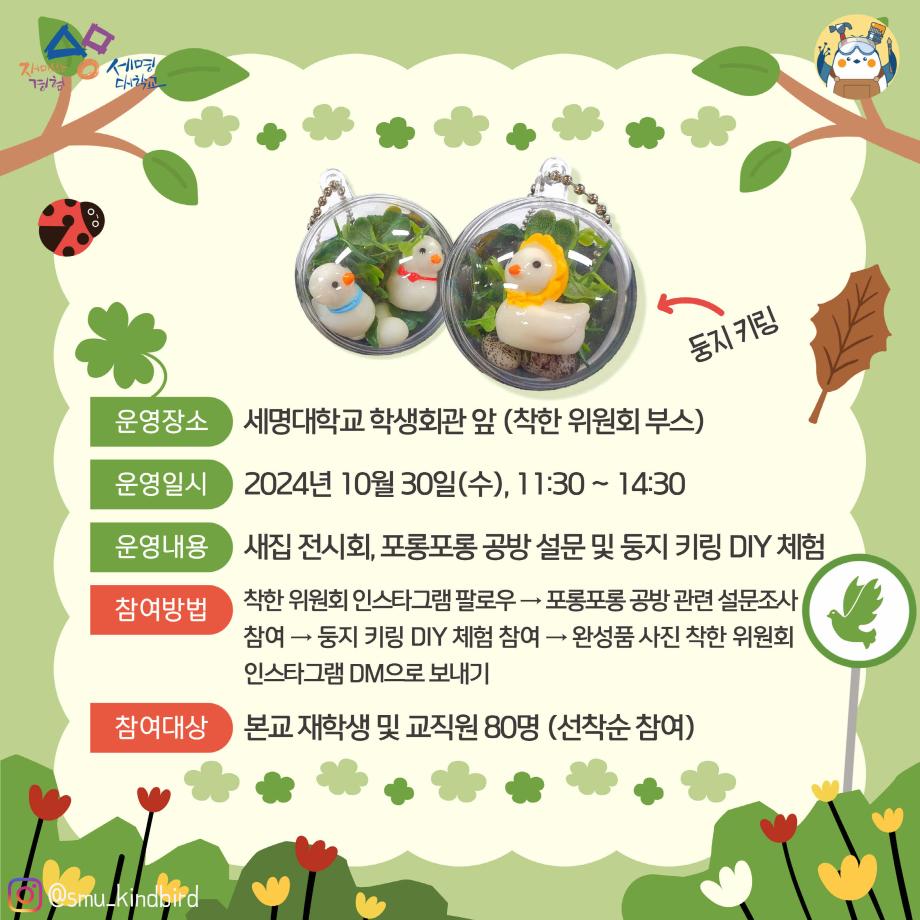 본문 시작 홈으로 공지사항 학생위원회 개요 학생위원회 소개 공지사항 활동결과 홈페이지가이드 프로그램 계획 프로그램 계획 세명대학교 공지사항 프로그램 계획 페이스북 트위터 프린트 [착한 위원회] 포롱포롱 공방의 외출 학생처 1236 2024-10-30 [착한 위원회] 포롱포롱 공방의 외출 1. 행사일시 ■ 2024년 10월 30일(수), 11시 30분~14시 30분 2. 행사장소 ■ 본교 학생회관 앞 착한 위원회 부스 3. 행사내용 ■ 새집 전시회 - 2024학년도 2학기 포롱포롱 공방 활동을 통해 제작한 새집 전시 [2학기 월별(9월~12월) 테마를 담은 새집] ■ 포롱포롱 공방 관련 설문조사 및 둥지 키링 DIY 체험 - 본교 재학생 및 교직원 80명 대상(선착순) 목록 이전[알려주는 위원회] 너의 마음을 알려줘 다음 [통하는 위원회] 추억의 놀이터&문방구 담당부서 : 장학복지팀 담당자 : - 연락처 : 043-649-1142 최종수정일 : 2024-10-26 만족도조사 만족도 조사 이 페이지에서 제공하는 정보에 대하여 만족하시나요? 매우만족 만족 보통 불만족 매우불만족