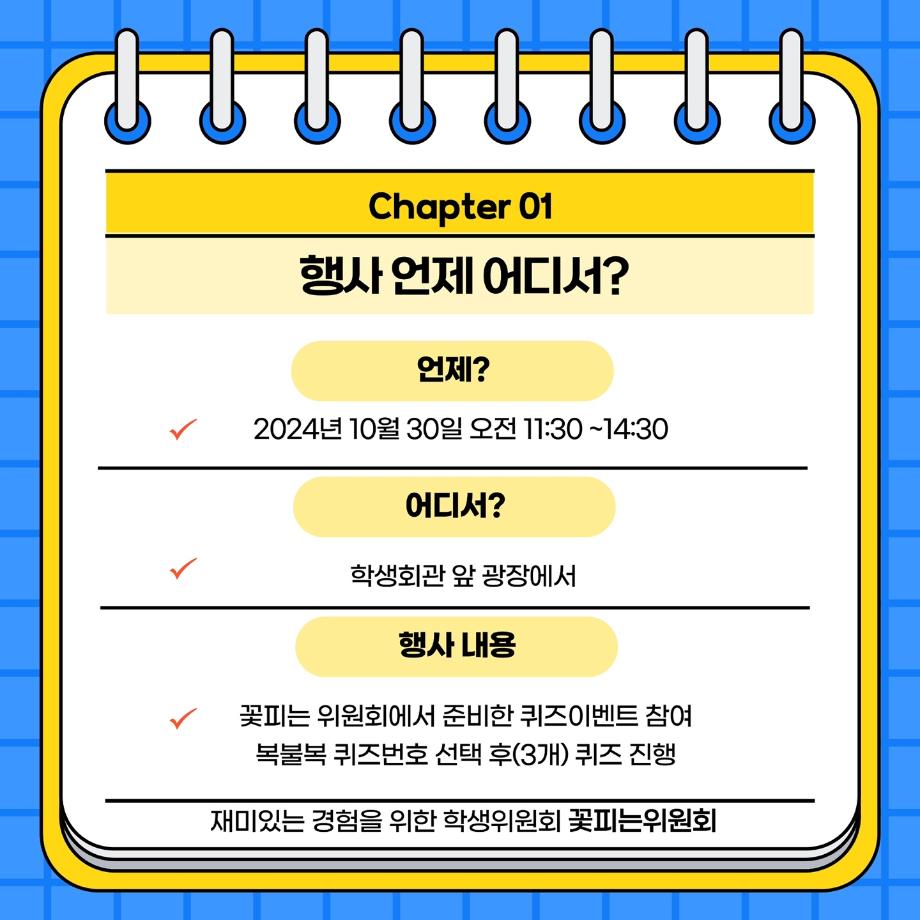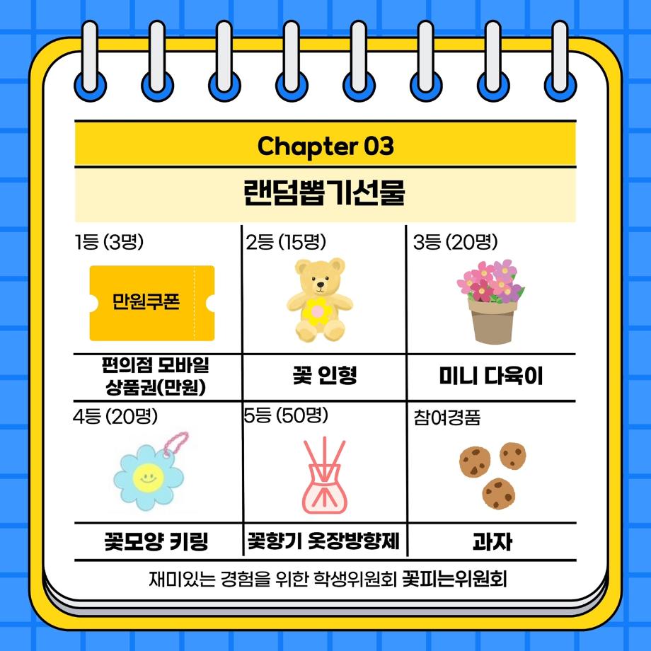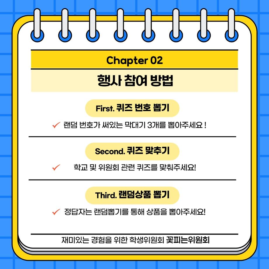 본문 시작 홈으로 공지사항 학생위원회 개요 학생위원회 소개 공지사항 활동결과 홈페이지가이드 프로그램 계획 프로그램 계획 세명대학교 공지사항 프로그램 계획 페이스북 트위터 프린트 [꽃피는 위원회] 퀴즈이벤트 YOU QUIZ? 학생처 1361 2024-10-30 꽃피는 위원회에서는 학생위원회를 알리고 꽃피는 위원회 활동을 홍보하기위하여 아래와 같이 퀴즈이벤트를 실시합니다. 많은 참여부탁드립니다. 일시 : 2024.11.30(수) 11:30 ~ 14:30 장소 : 학생회관 앞 광장 참여방법 1) 복물복 퀴즈문제 선택(3문제) 2) 선택한 퀴즈풀기 3) 2문제 이상 정답자는 복불복 경품추첨기회(1등~5등) 제공 4) 1문제 이하 정답자는 과자 또는 젤리 선물 목록 이전[따뜻한 위원회] 아기세룡 반갑세룡 다음 -용감한 위원회] 도전! 인테리어창업 담당부서 : 장학복지팀 담당자 : - 연락처 : 043-649-1142 최종수정일 : 2024-10-26 만족도조사 만족도 조사 이 페이지에서 제공하는 정보에 대하여 만족하시나요? 매우만족 만족 보통 불만족 매우불만족