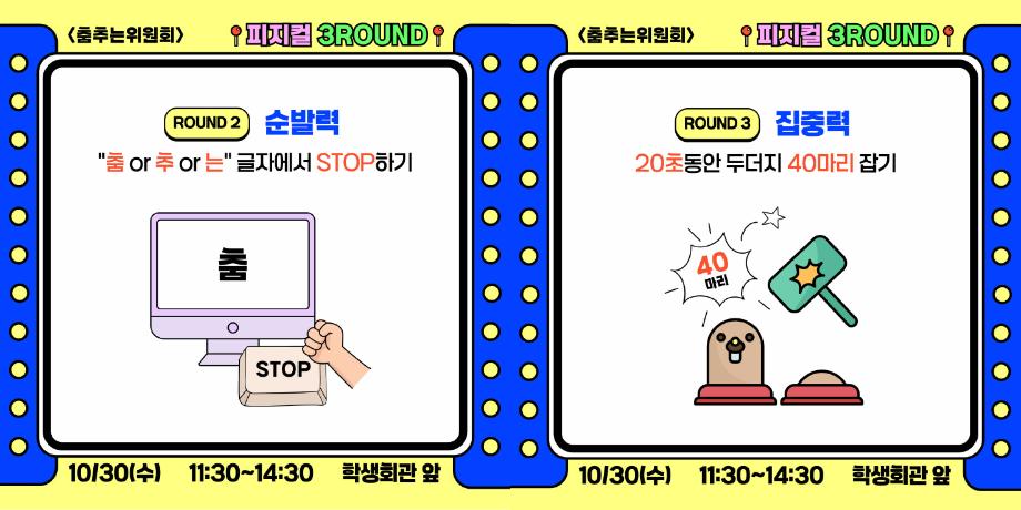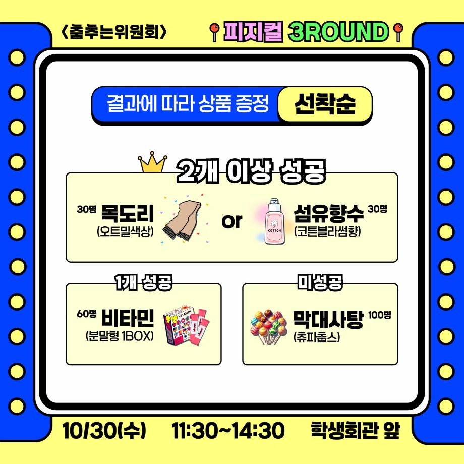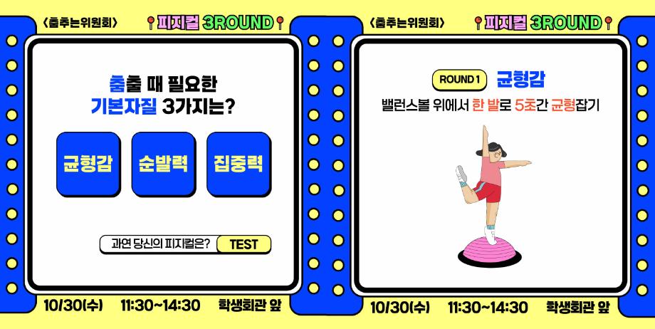 본문 시작 홈으로 공지사항 학생위원회 개요 학생위원회 소개 공지사항 활동결과 홈페이지가이드 프로그램 계획 프로그램 계획 세명대학교 공지사항 프로그램 계획 페이스북 트위터 프린트 [춤추는 위원회]피지컬3ROUND 학생처 1379 2024-10-30 [춤추는 위원회] 피지컬3ROUND 춤출 때 필요한 기본자질테스트 1. 균형감 : 밸런스볼 위에서 한발로 5초간 균형잡기 2. 순발력 : 춤OR 추OR 는 글자에서 STOP하기 3. 집중력 : 20초동안 두더지 40만리 잡기 참여결과에 따라 상품증정(선착순)하니 많은 참여부탁드립니다. 목록 이전-용감한 위원회] 도전! 인테리어창업 다음 [벗어나는 위원회] 벗어나는 위원회와 함께하는 스트레스를 벗어나자! 담당부서 : 장학복지팀 담당자 : - 연락처 : 043-649-1142 최종수정일 : 2024-10-26 만족도조사 만족도 조사 이 페이지에서 제공하는 정보에 대하여 만족하시나요? 매우만족 만족 보통 불만족 매우불만족