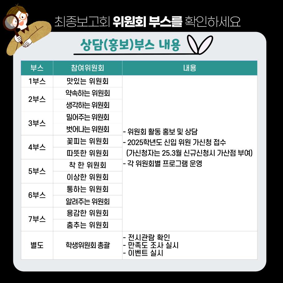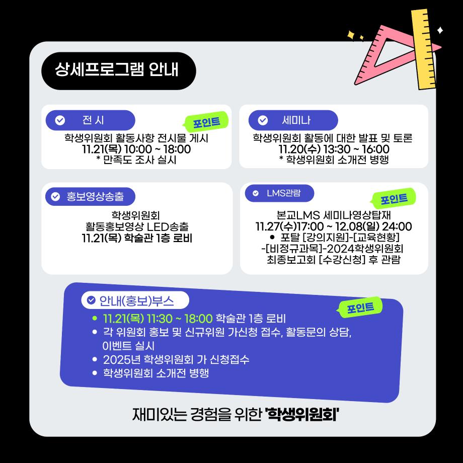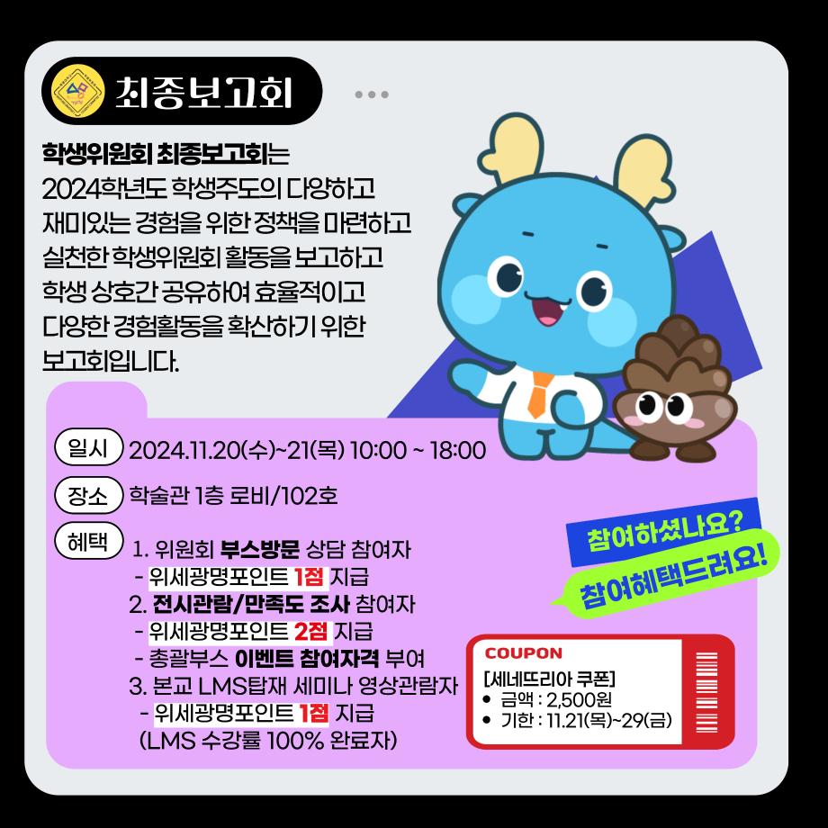 본문 시작 홈으로 공지사항 학생위원회 개요 학생위원회 소개 공지사항 활동결과 홈페이지가이드 프로그램 계획 프로그램 계획 세명대학교 공지사항 프로그램 계획 페이스북 트위터 프린트 학생위원회 최종보고회 학생처 1818 2024-11-20 < 학생위원회 최종보고회 > 일시 : 2024.11.20(수)~21(목) 장소 : 학술관 1층 로비 내용 : 활동실적 발표(세미나), 위원회 소개전, 활동실적 전시(전시), 안내(홍보)부스 진행, 개별 프로그램 진행 목록 이전[이상한 위원회] 이상하거나 '이'상하거나 다음 [따뜻한 위원회] 넌 이름이 뭐니? 담당부서 : 장학복지팀 담당자 : - 연락처 : 043-649-1142 최종수정일 : 2024-10-26 만족도조사 만족도 조사 이 페이지에서 제공하는 정보에 대하여 만족하시나요? 매우만족 만족 보통 불만족 매우불만족
