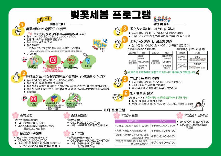 본문 시작 홈으로 공지사항 학생위원회 개요 학생위원회 소개 공지사항 활동결과 홈페이지가이드 프로그램 계획 프로그램 계획 세명대학교 공지사항 프로그램 계획 페이스북 트위터 프린트 [꽃피는 위원회]제4회 세명대학교 벚꽃축제 '벚꽃세봄' 학생처 1074 2025-03-31 [꽃피는 위원회]제4회 세명대학교 벚꽃축제 '벚꽃세봄' 일시 : 2025.04.08(화)~09(수) 11:00~17:00 장소 : 뭐든지광장 일원 내용 : 공연, 이벤트, 체험, 포토존 운영 등 다양한 행사 진행 목록 이전2025학년도 재미있는 경험을 위한 학생위원회 모집 안내 다음 [용감한 위원회]나만의 하바리움, 공방 창업의 시작! 담당부서 : 장학복지팀 담당자 : - 연락처 : 043-649-1142 최종수정일 : 2024-10-26 만족도조사 만족도 조사 이 페이지에서 제공하는 정보에 대하여 만족하시나요? 매우만족 만족 보통 불만족 매우불만족