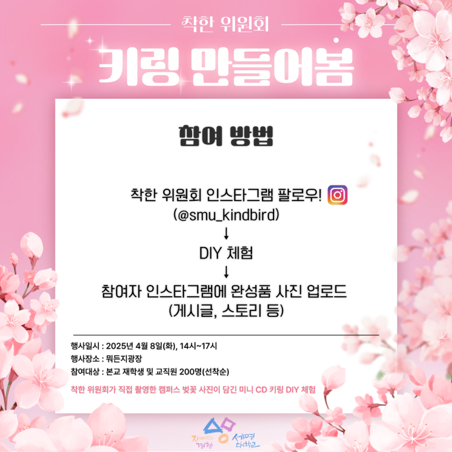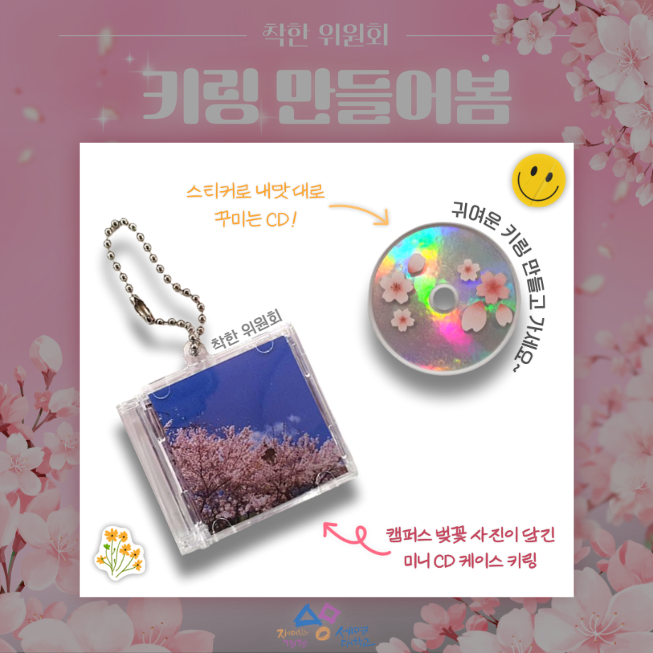본문 시작 홈으로 공지사항 학생위원회 개요 학생위원회 소개 공지사항 활동결과 홈페이지가이드 프로그램 계획 프로그램 계획 세명대학교 공지사항 프로그램 계획 페이스북 트위터 프린트 [착한 위원회] 키링만들어봄 학생처 932 2025-04-08 [착한 위원회] 키링 만들어봄 1. 행사일시 ■ 2025년 4월 8일(화), 14시~17시 2. 행사장소 ■ 본교 뭐든지광장 3. 행사내용 ■ 착한 위원회가 직접 촬영한 캠퍼스 벚꽃 사진이 담긴 미니 CD 키링 DIY 체험 ■ 본교 재학생 및 교직원 200명 대상(선착순) 목록 이전[맛있는 위원회]맛있나봄 다음 [이상한 위원회]🌸이상한 위원회 벚꽃 포토존 홍보🌸 담당부서 : 장학복지팀 담당자 : - 연락처 : 043-649-1142 최종수정일 : 2024-10-26 만족도조사 만족도 조사 이 페이지에서 제공하는 정보에 대하여 만족하시나요? 매우만족 만족 보통 불만족 매우불만족